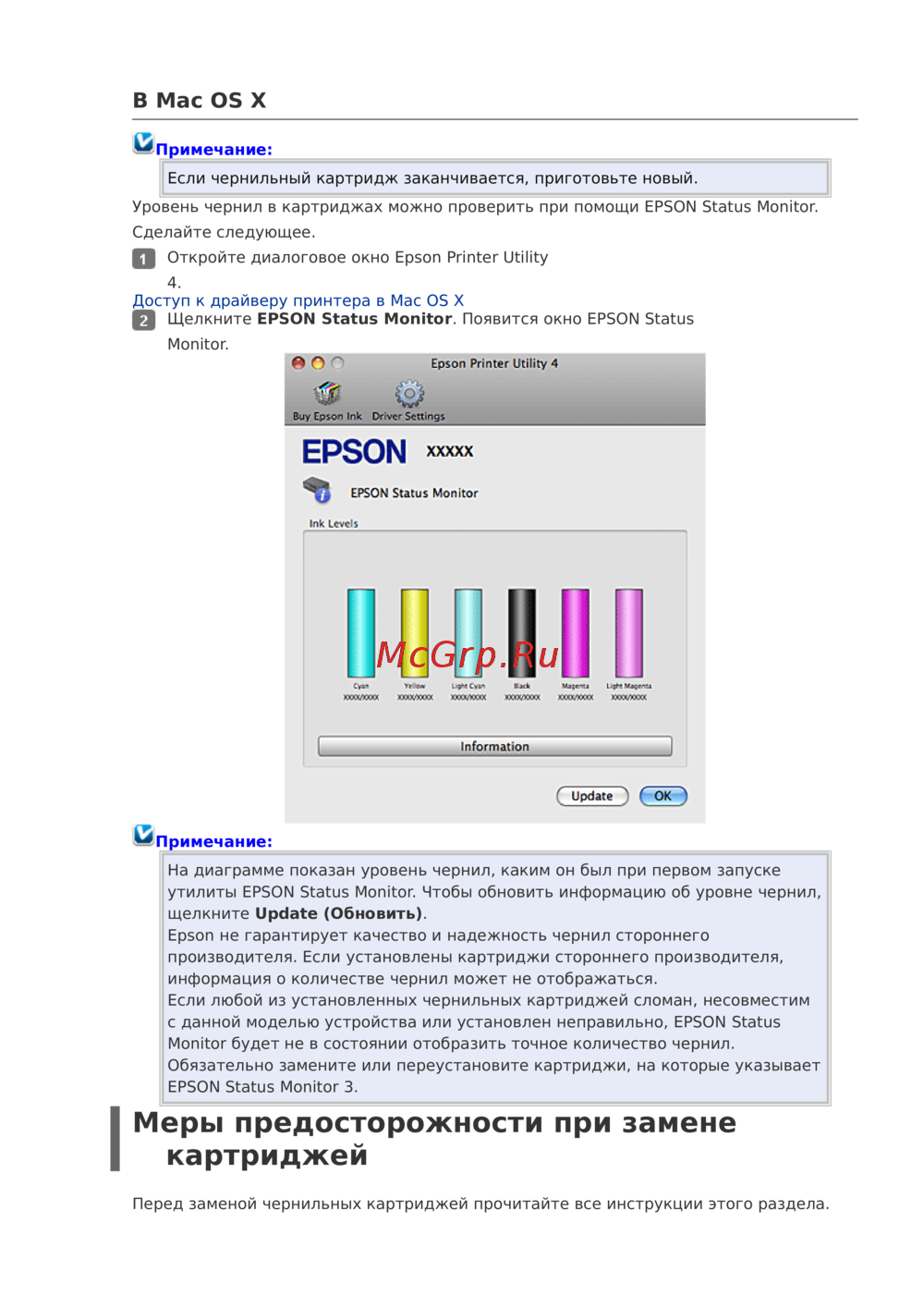 утилиты EPSON Status Monitor. Чтобы обновить информацию об уровне чернил,