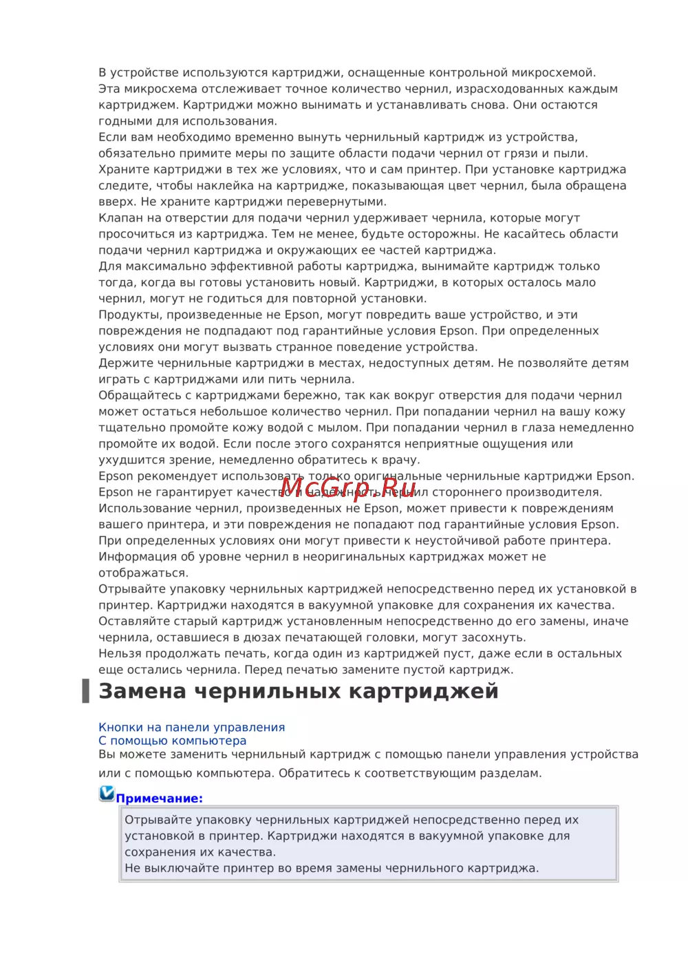 Использование чернил, произведенных не Epson, может привести к повреждениям