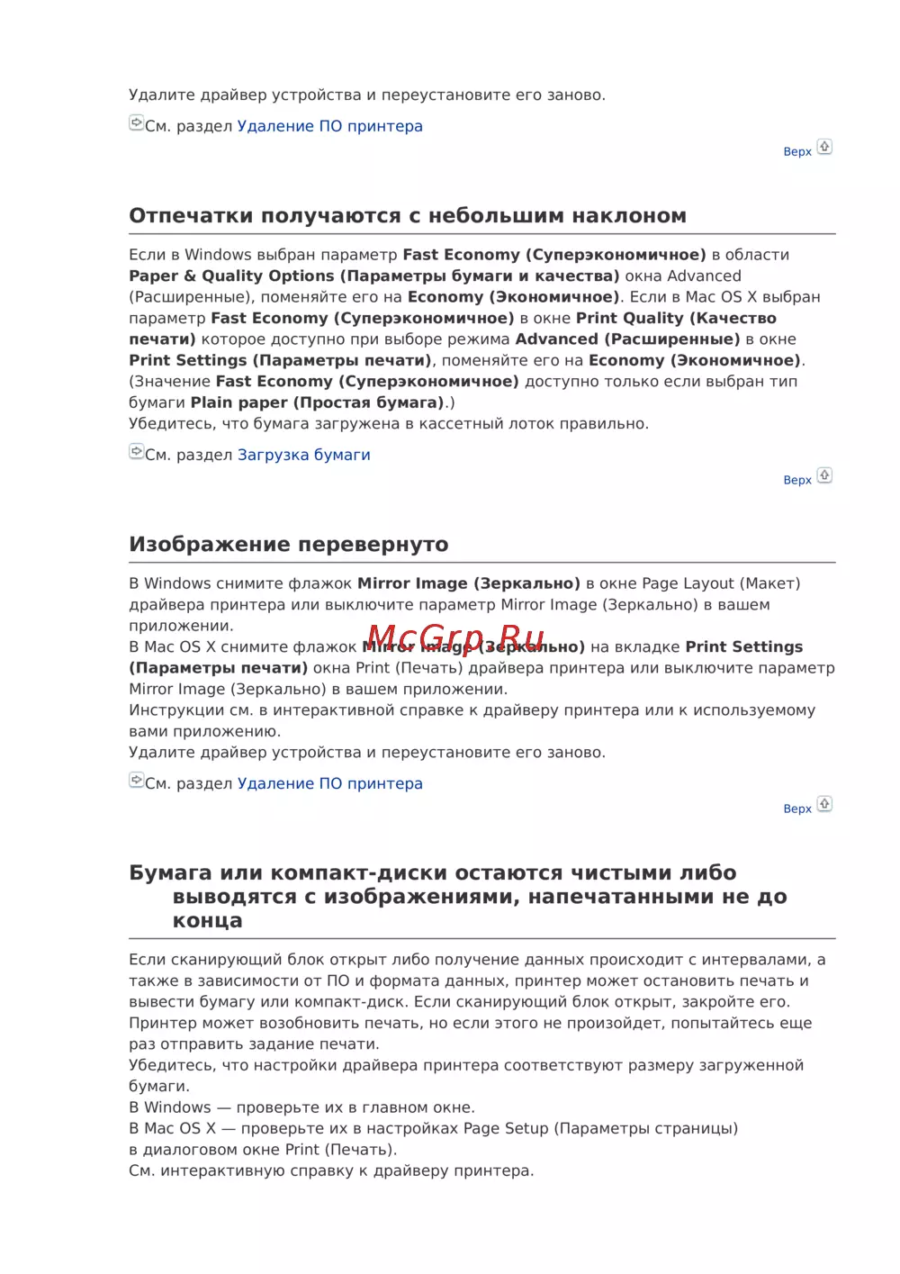 - Бумага или компакт диски остаются чистыми либо выводятся с изображениями напечатанными не до конца p.87