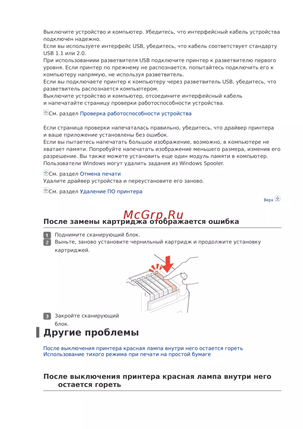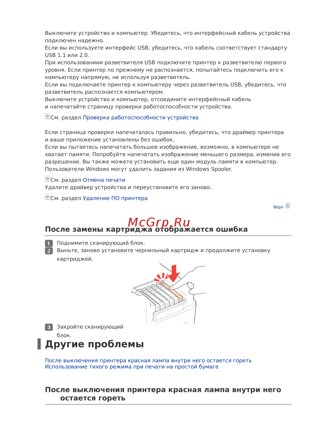 - После выключения принтера красная лампа внутри него остается гореть p.90