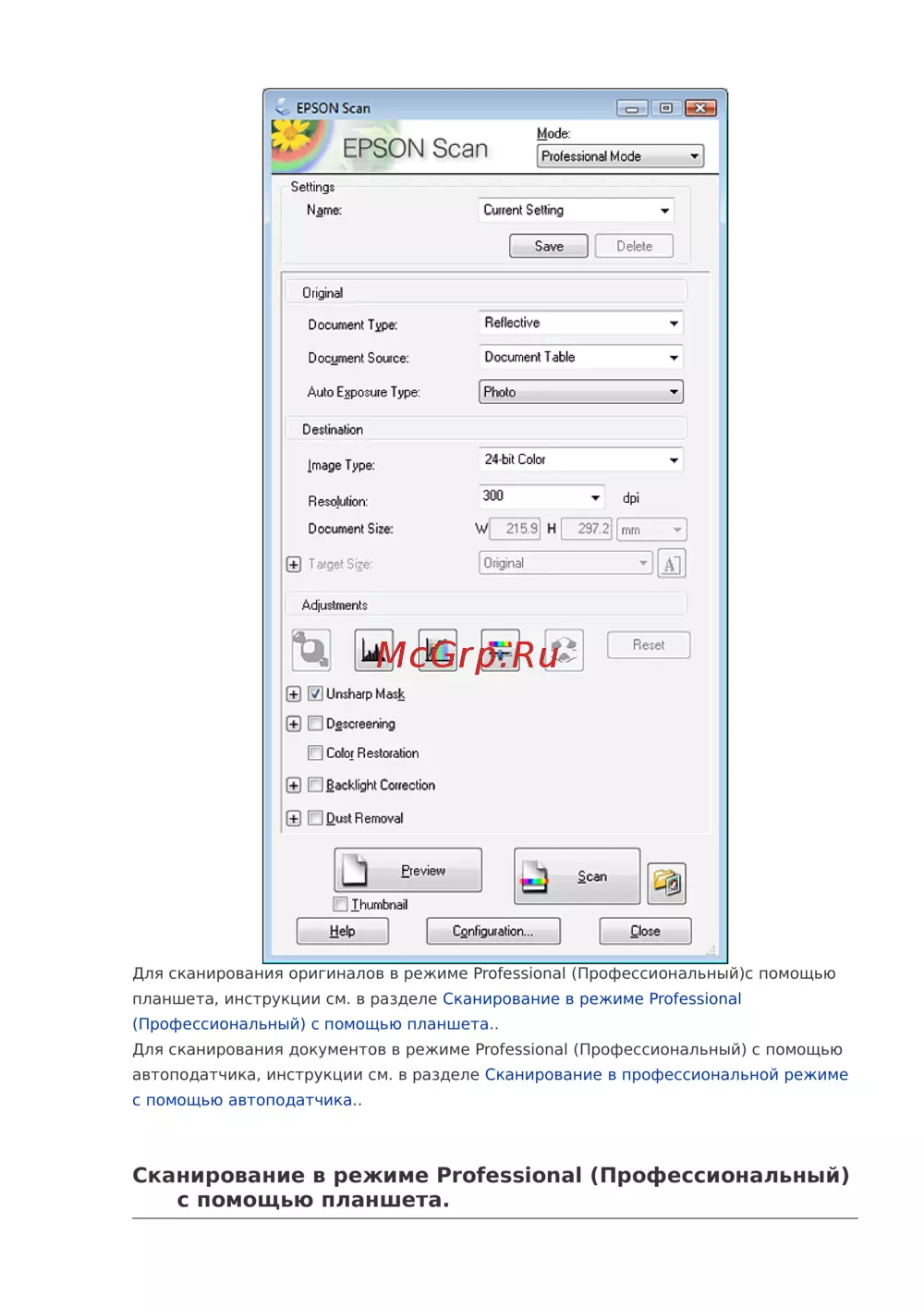Для сканирования документов в режиме Professional (Профессиональный) с помощью