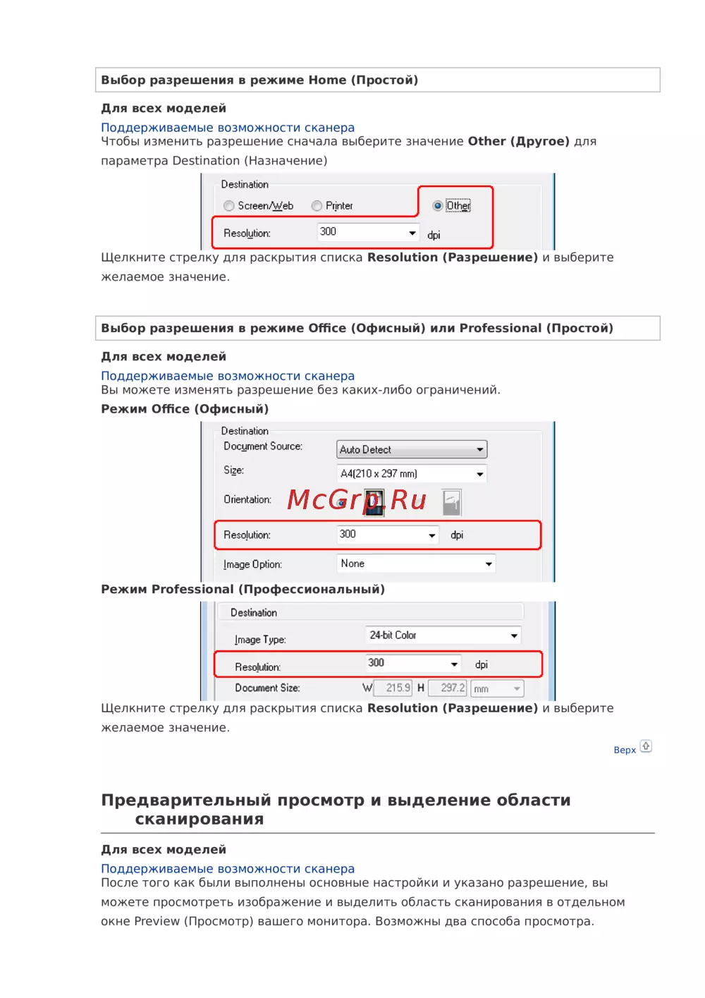 - Выбор размера отсканированного изображения в режиме professional профессиональный p.158