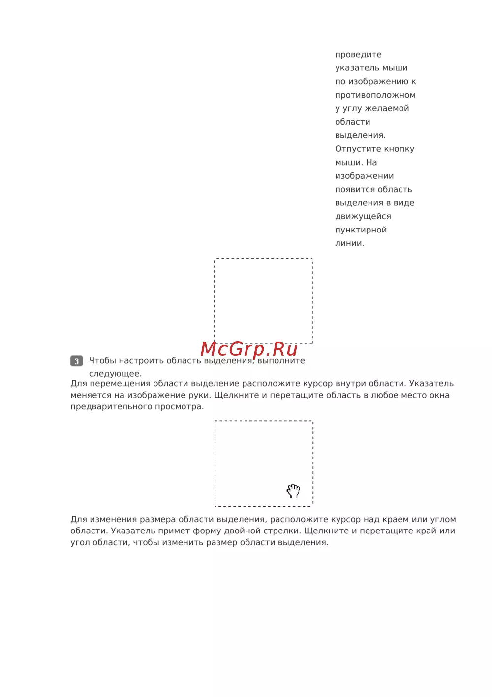 Для изменения размера области выделения, расположите курсор над краем или углом