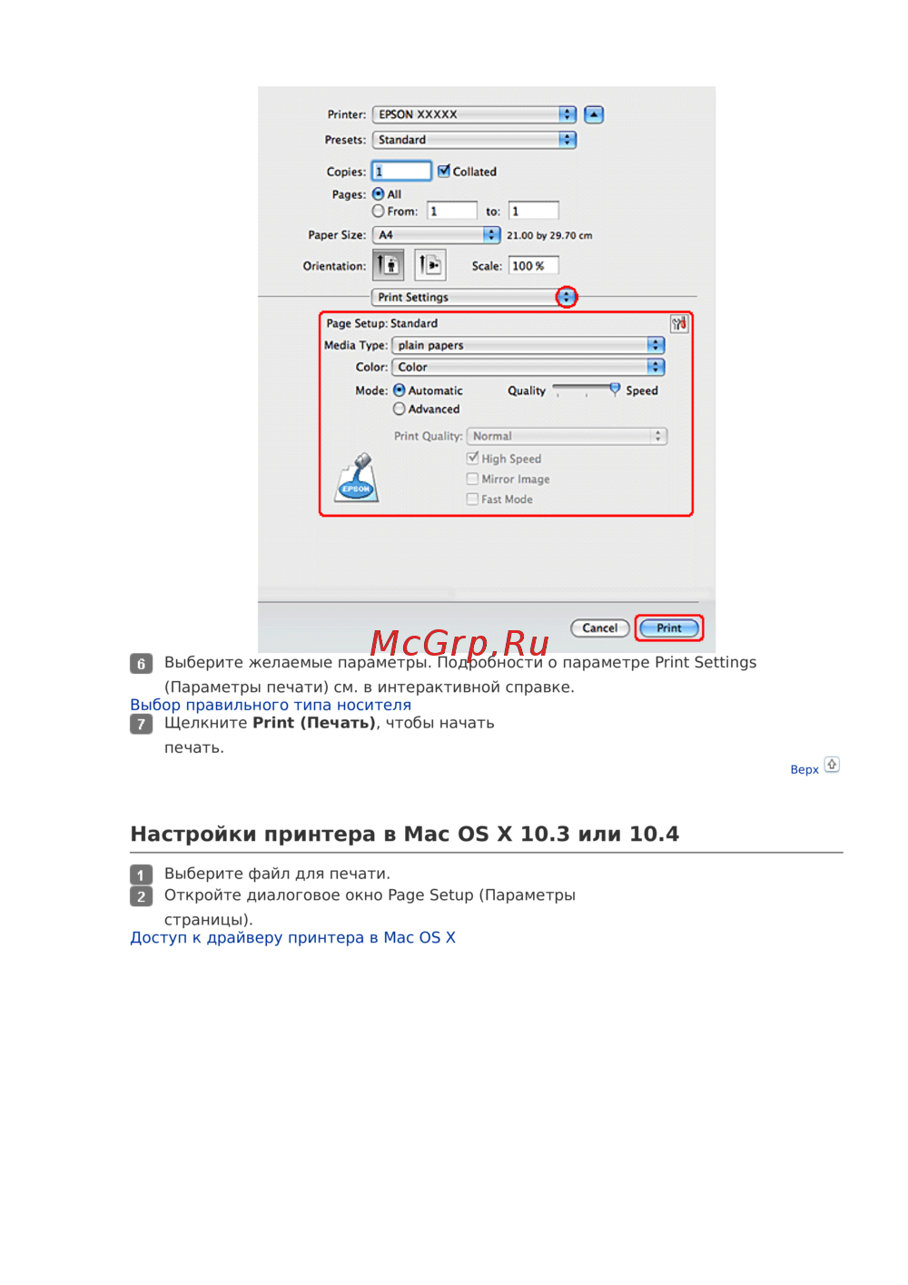 Настройки принтера в Mac OS X 10.3 или 10.4