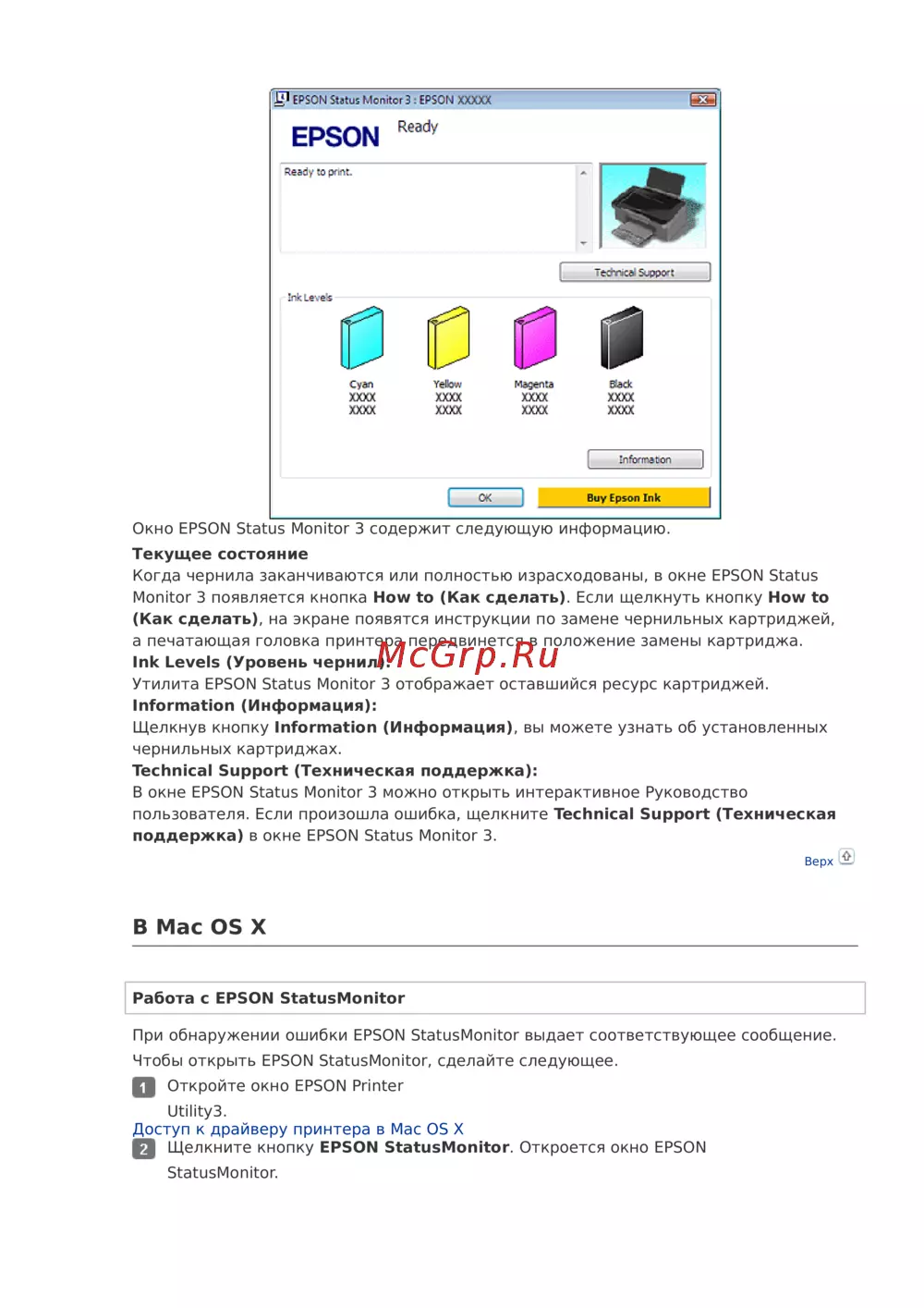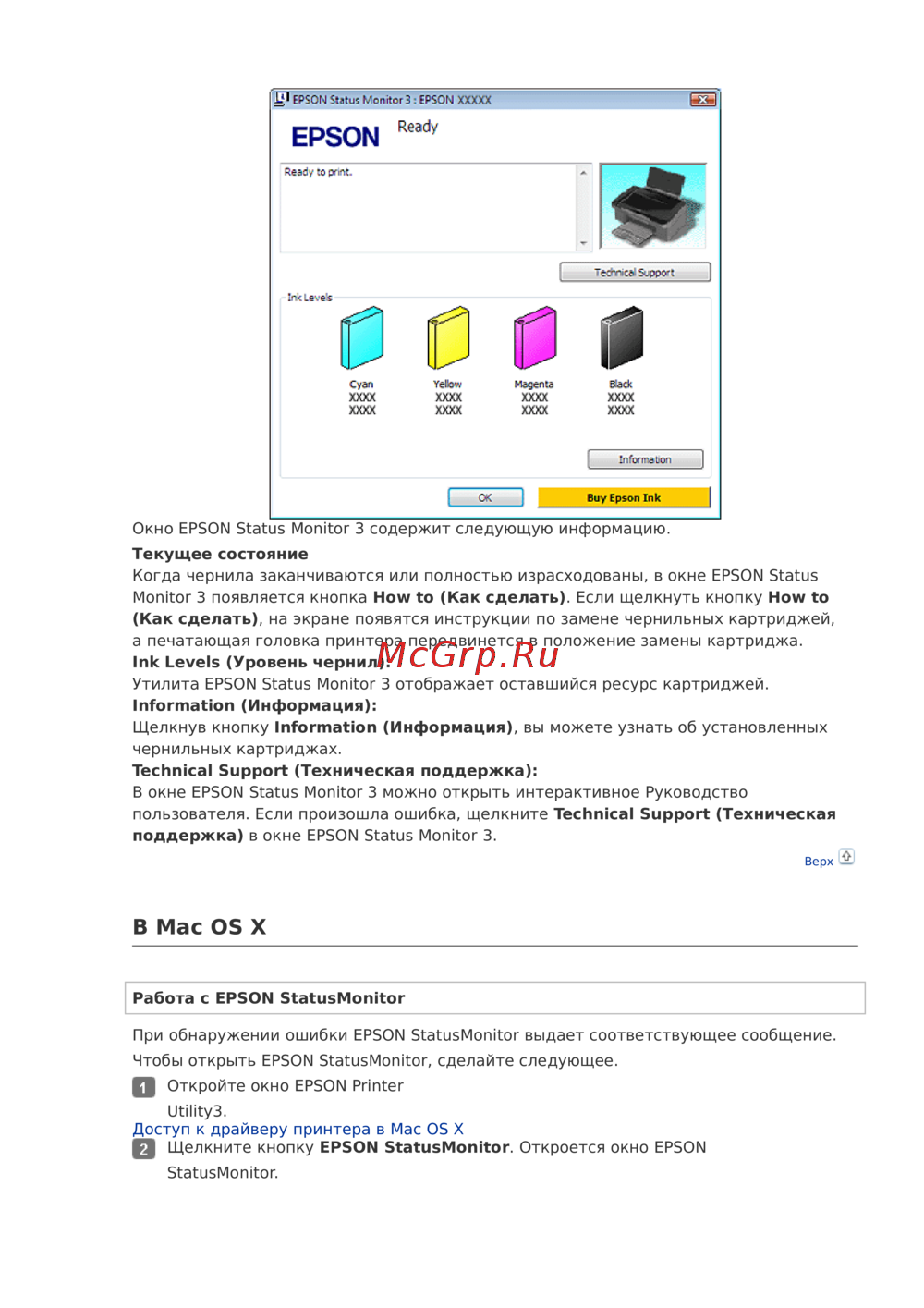 В окне EPSON Status Monitor 3 можно открыть интерактивное Руководство