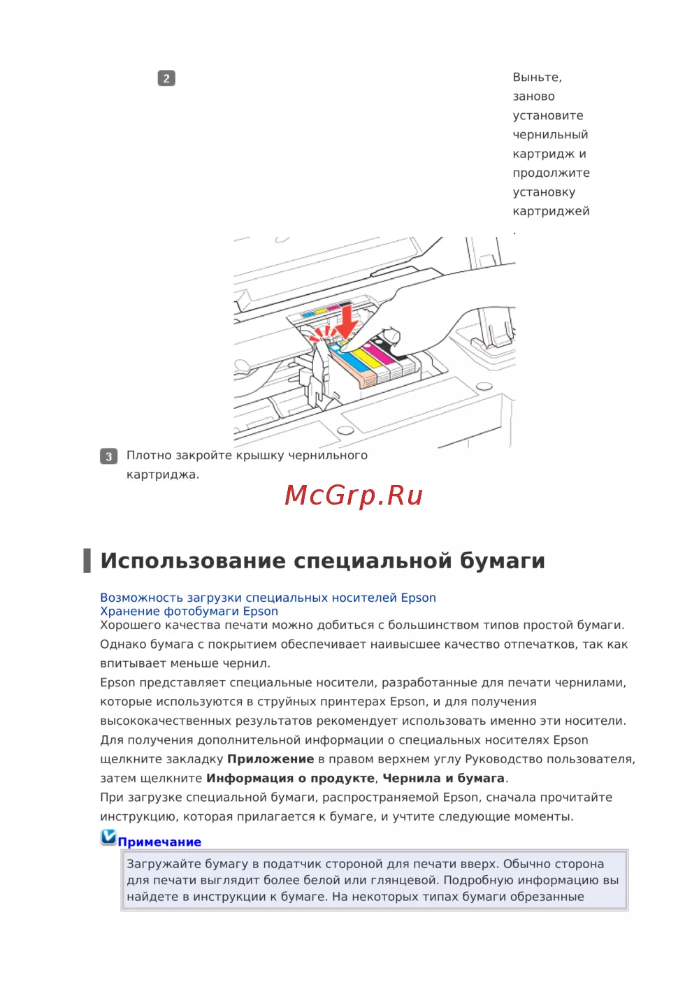 При загрузке специальной бумаги, распространяемой Epson, сначала прочитайте