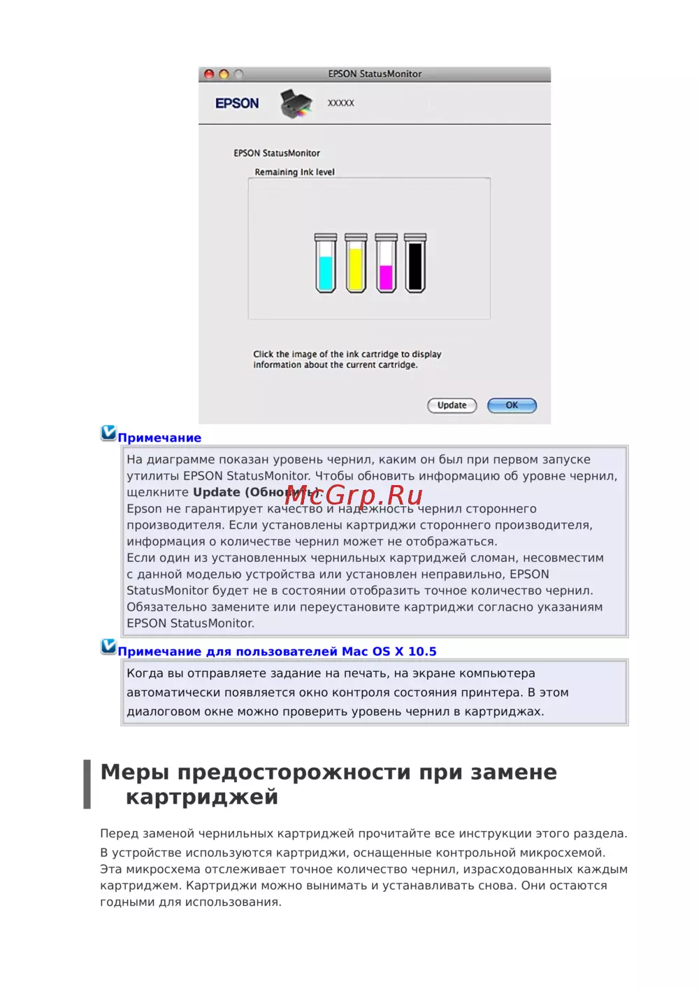 утилиты EPSON StatusMonitor. Чтобы обновить информацию об уровне чернил,