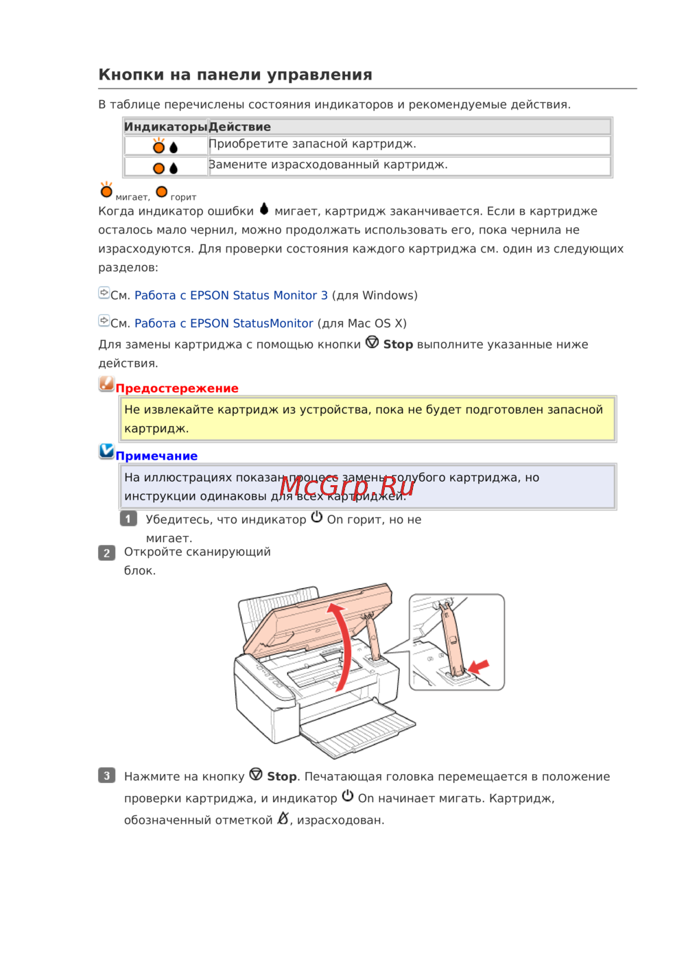 Для замены картриджа с помощью кнопки Stop выполните указанные ниже