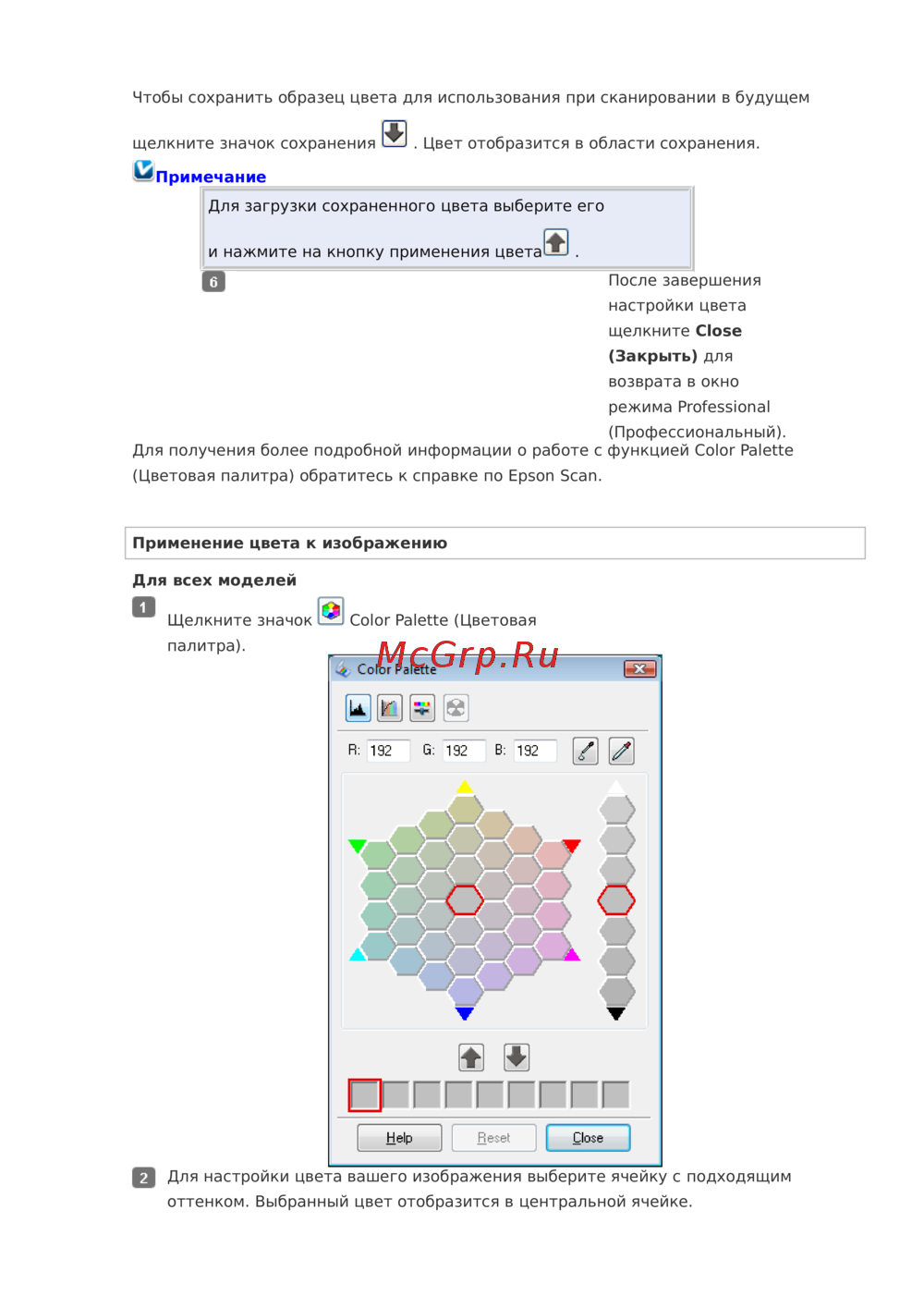 (Цветовая палитра) обратитесь к справке по Epson Scan.
