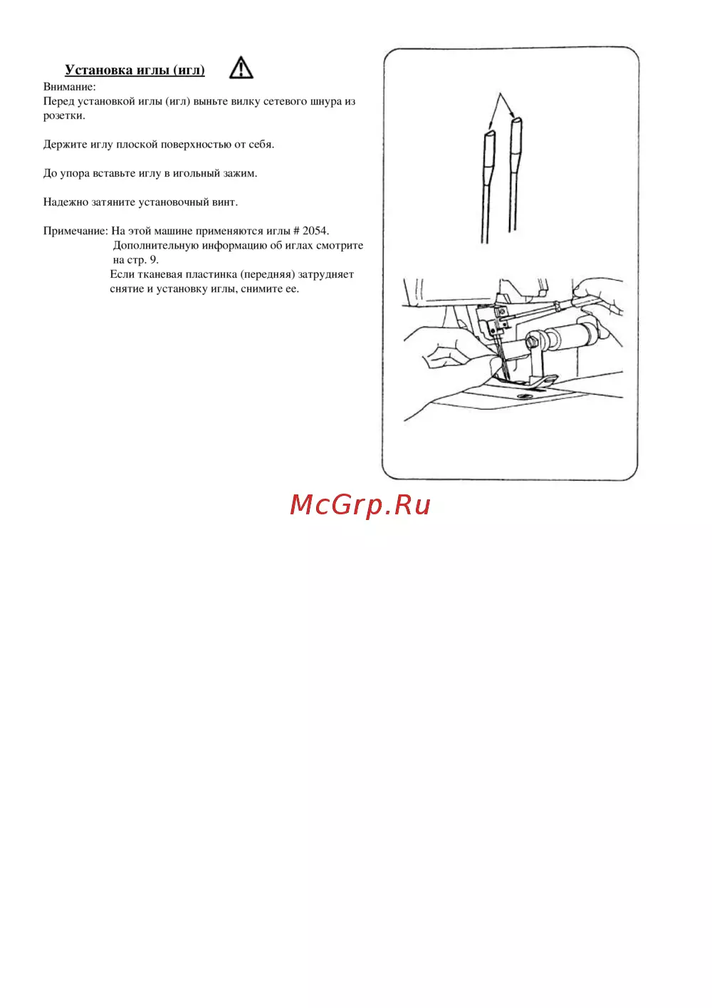 Перед установкой иглы (игл) выньте вилку сетевого шнура из
