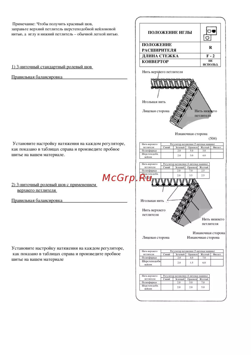 - Установите настройку натяжения на каждом регуляторе как показано в таблицах справа и произведите пробное шитье на вашем материале как производить балансировку p.88