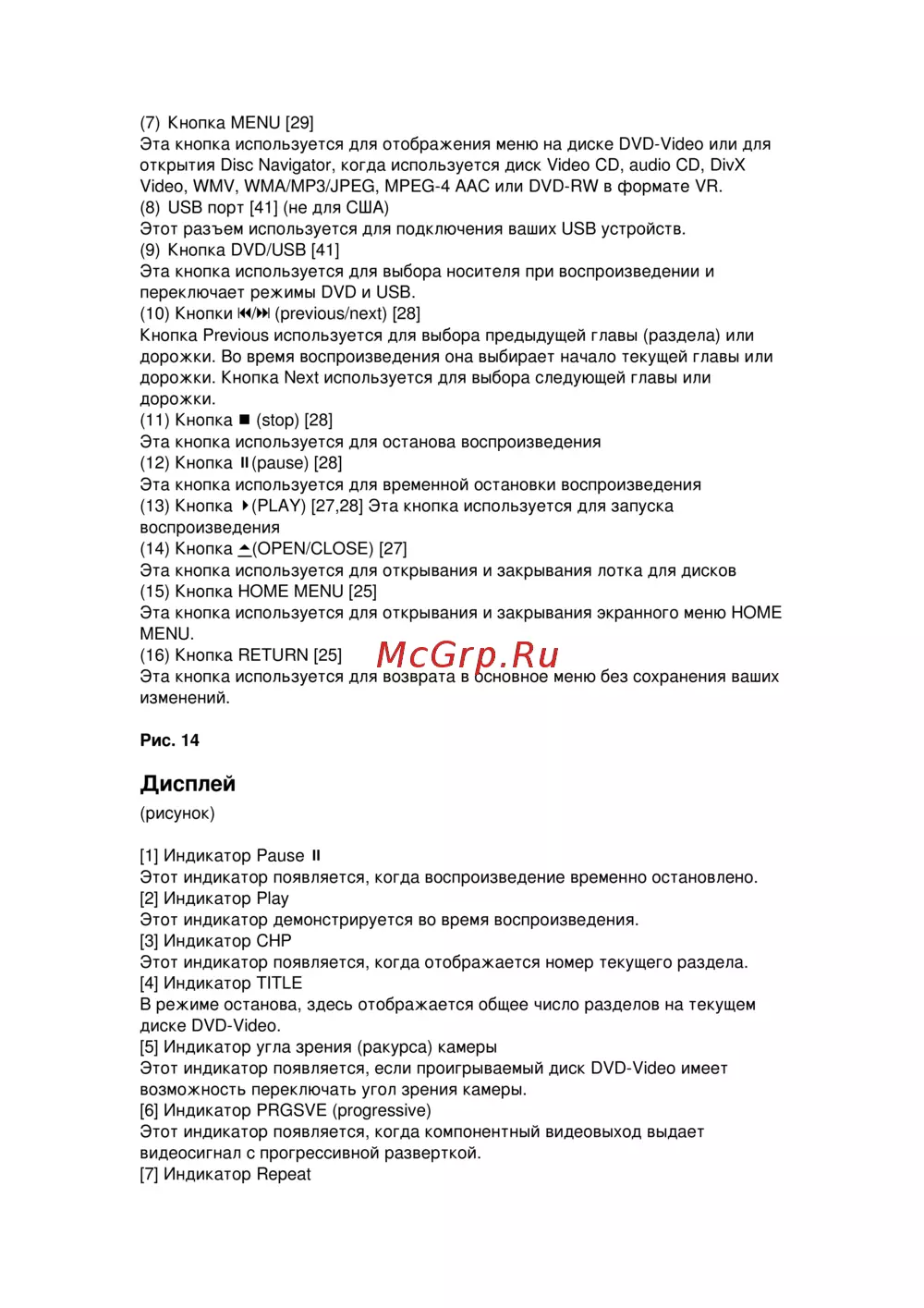 Узнайте о кнопках управления DVD и USB воспроизведением, включая меню, воспроизведение, паузу и остановку. Подробности о функциях и индикаторах на дисплее.