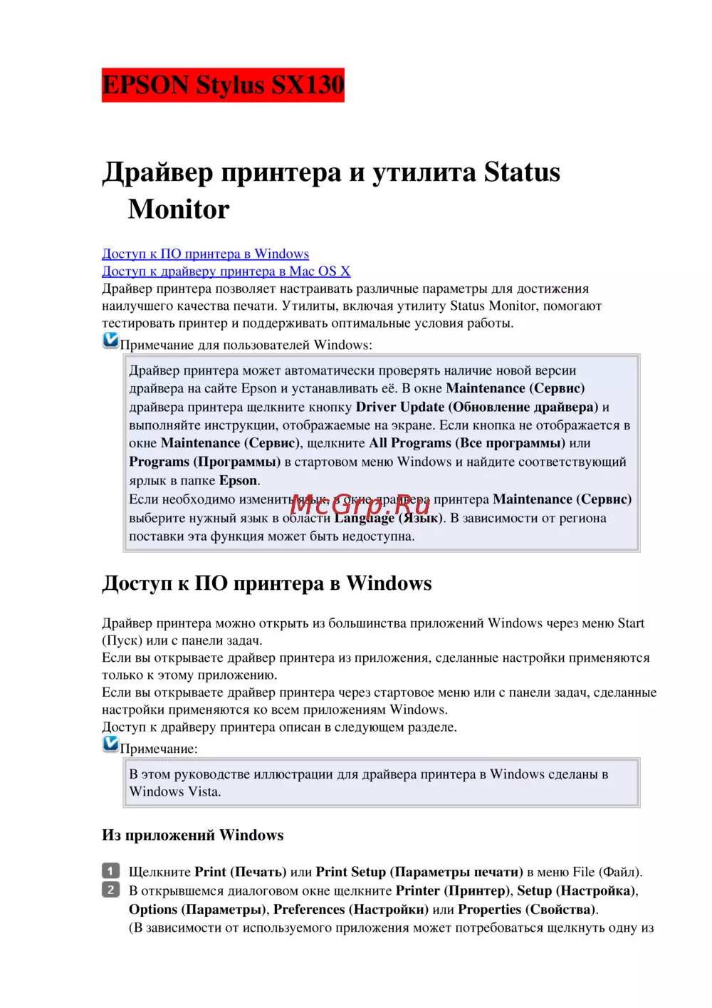 Доступ к драйверу принтера описан в следующем разделе.
