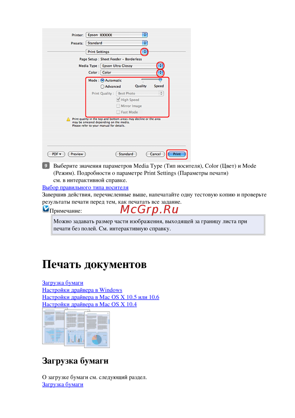 Узнайте, как выбрать параметры печати, включая тип носителя и цвет. Получите советы по загрузке бумаги и настройкам драйвера для Windows и Mac.