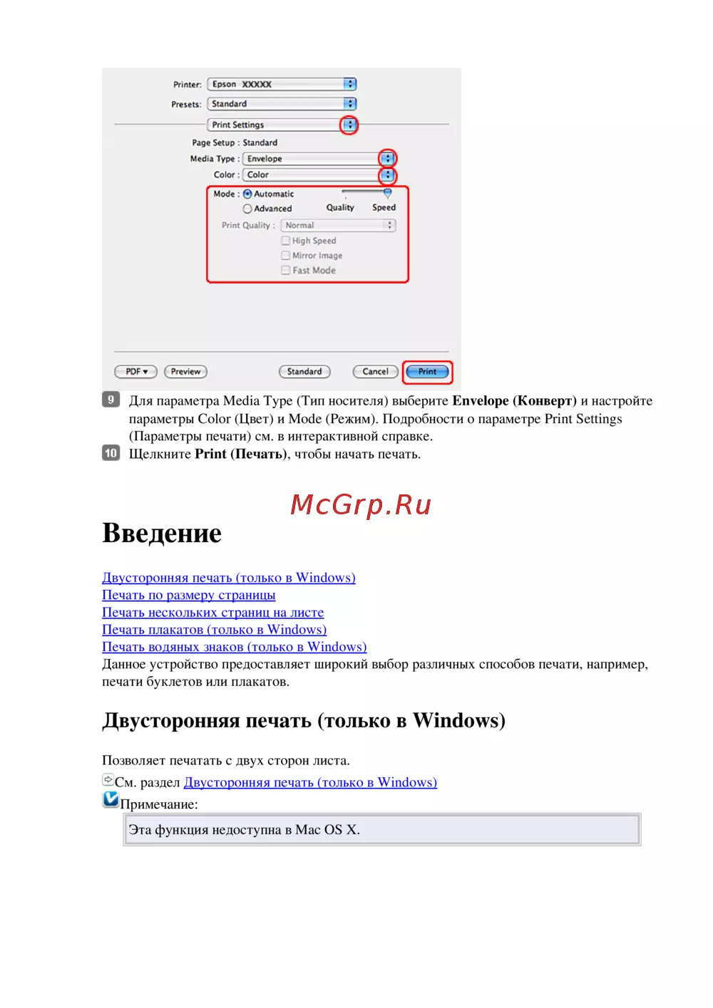 параметры Color (Цвет) и Mode (Режим). Подробности о параметре Print Settings