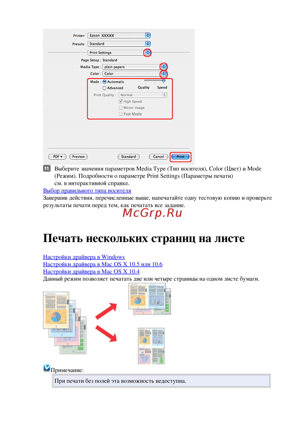 Данный режим позволяет печатать две или четыре страницы на одном листе бумаги.