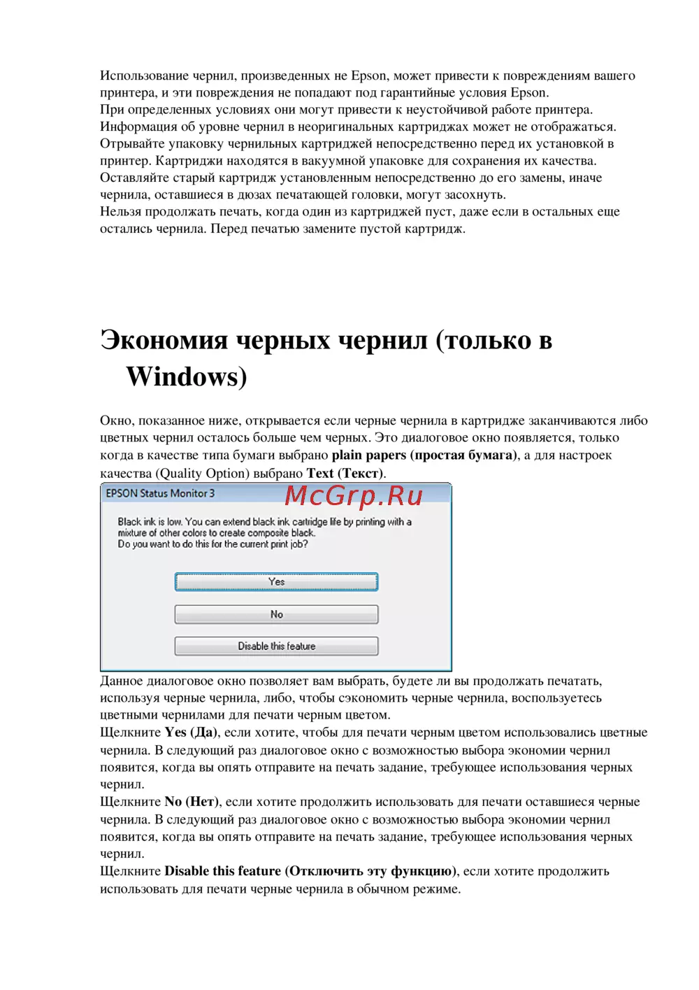 Окно, показанное ниже, открывается если черные чернила в картридже заканчиваются либо