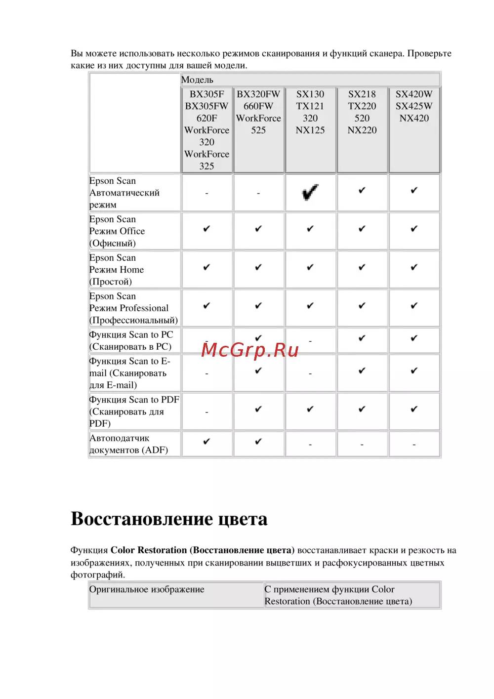 Изучите доступные режимы сканирования и функции для оптимизации работы с документами. Узнайте о восстановлении цвета и других полезных опциях.