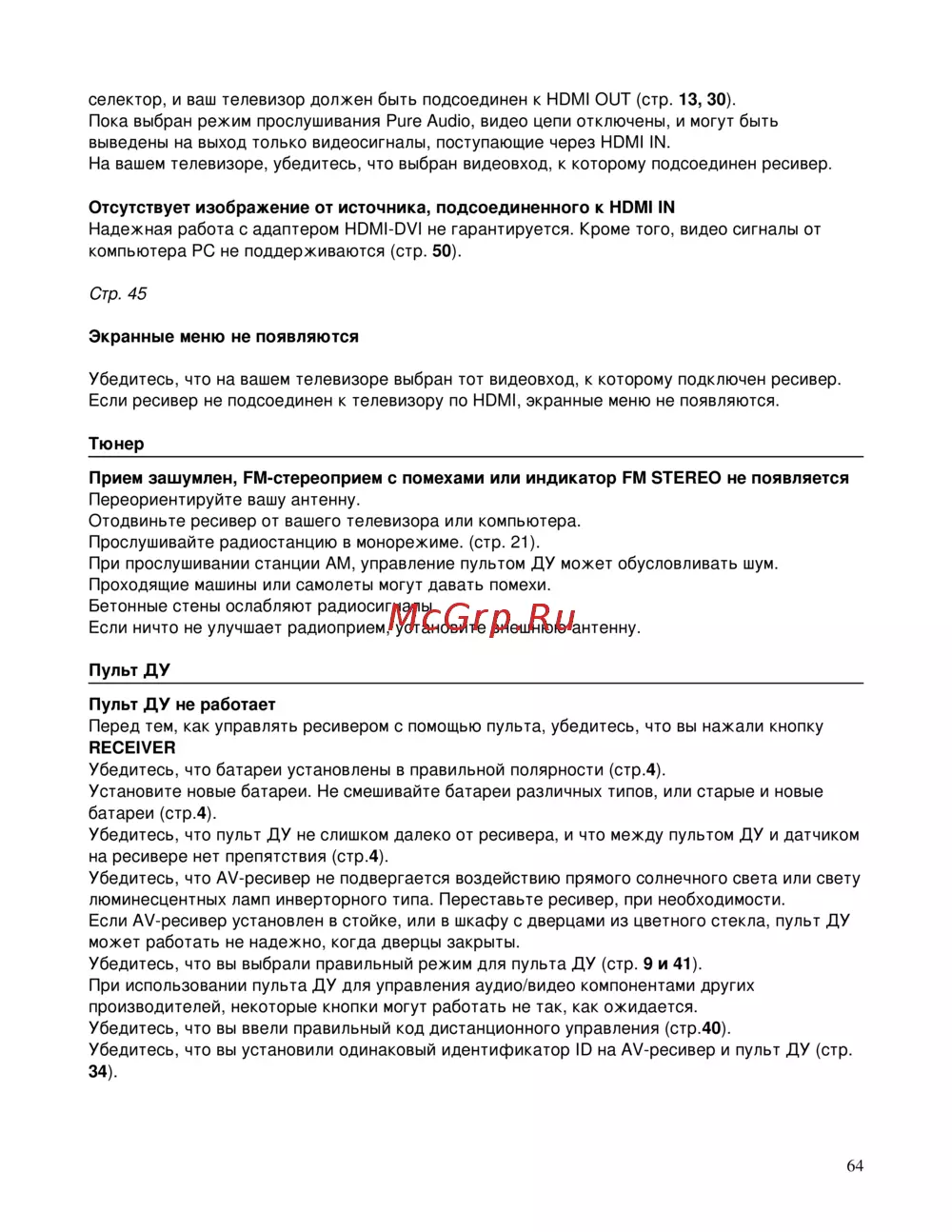 - Если ресивер не подсоединен к телевизору по hdmi экранные меню не появляются p.64