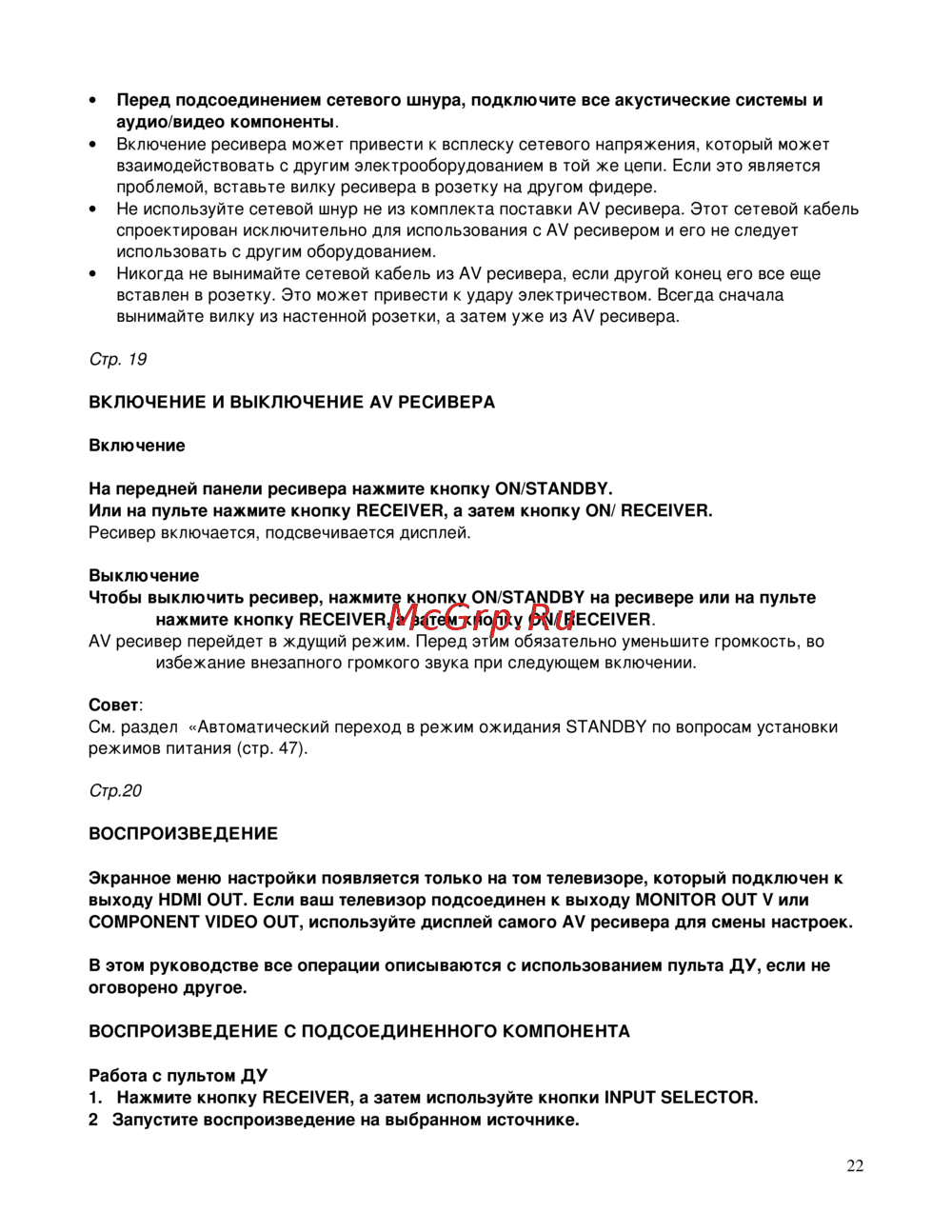 - Av ресивер перейдет в ждущий режим перед этим обязательно уменьшите громкость во избежание внезапного громкого звука при следующем включении p.22