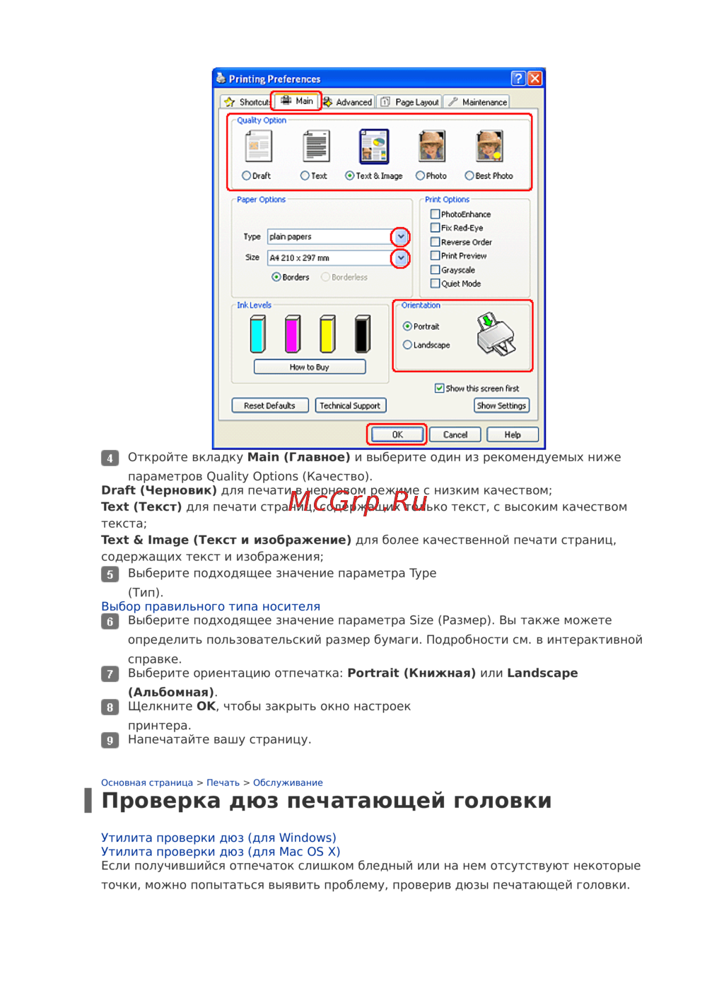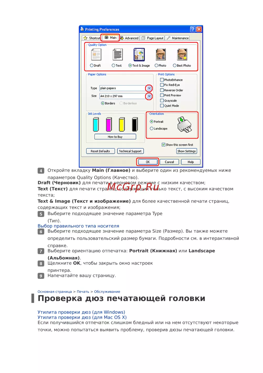 Узнайте, как выбрать параметры качества печати, тип носителя и размер бумаги. Настройте ориентацию отпечатка и проверьте дюзы печатающей головки для лучшего результата.