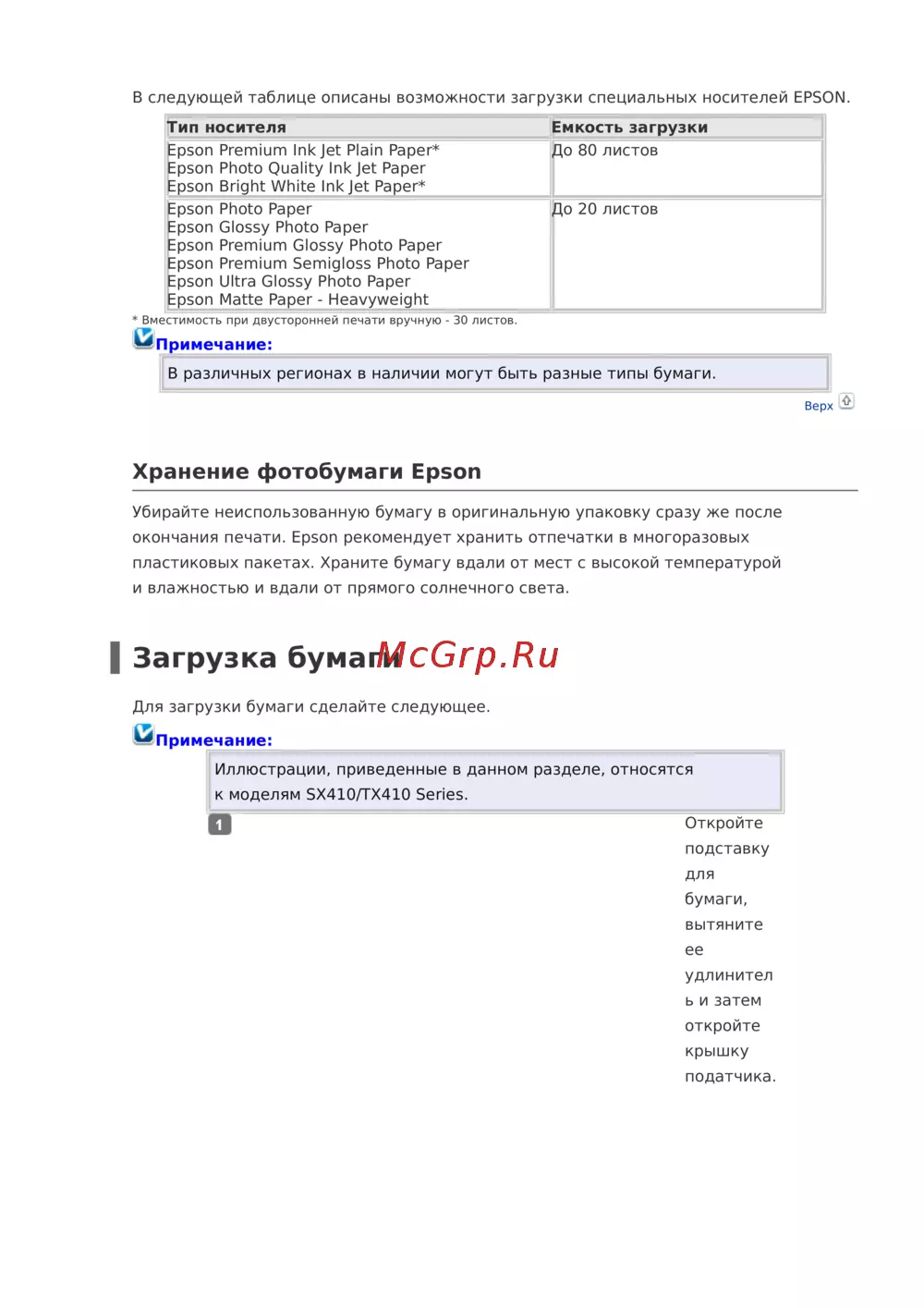 Epson TX410 — информация о загрузке и хранении фотобумаги для печати [19/42]