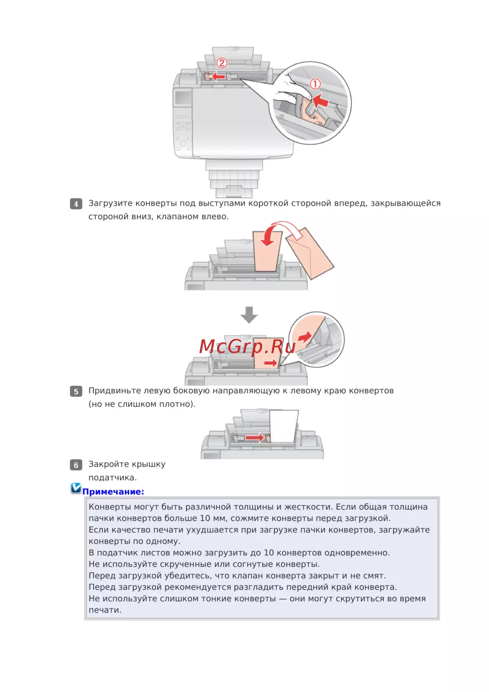 Узнайте, как правильно загружать конверты в податчик для печати. Следуйте рекомендациям по толщине, жесткости и подготовке конвертов для качественной печати.