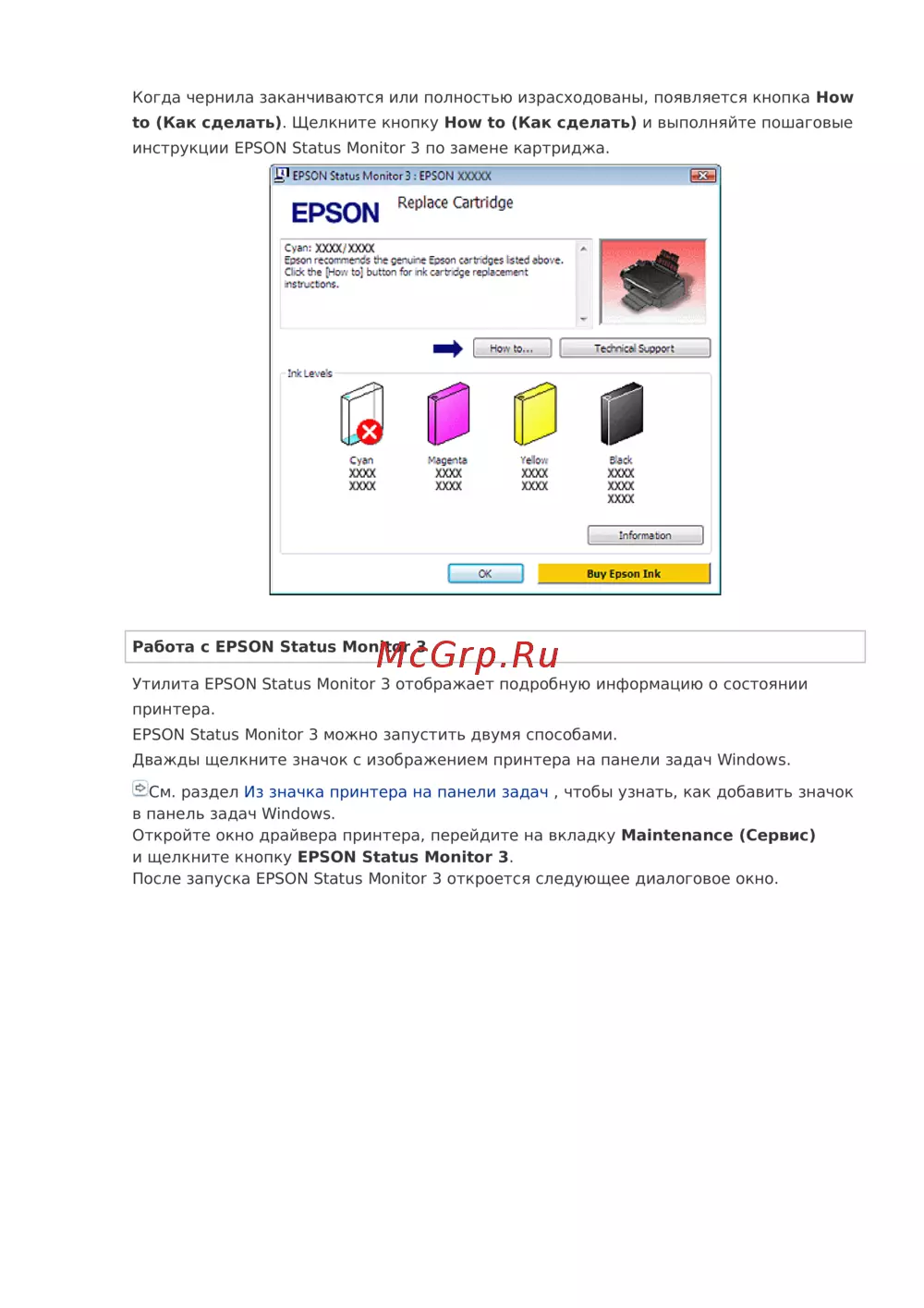 инструкции EPSON Status Monitor 3 по замене картриджа.