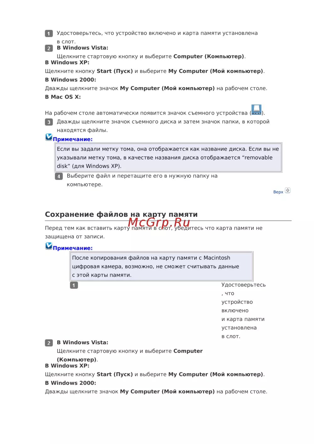 - Обмен файлами между картой памяти и компьютером p.39