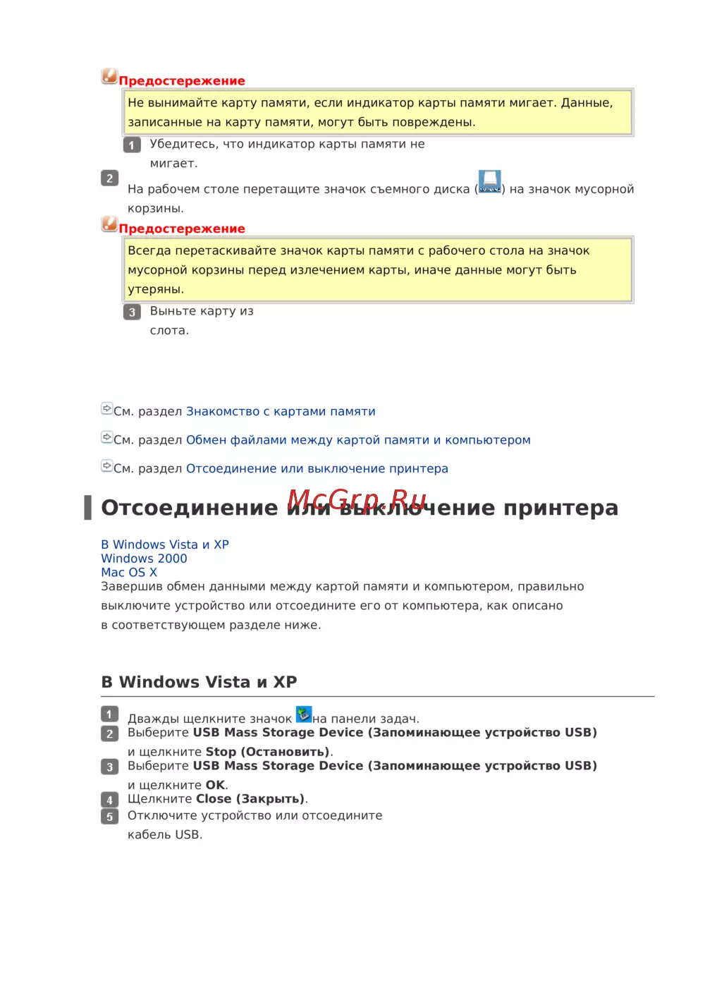 - Меры предосторожности при обмене файлами между компьютером и картой памяти p.39