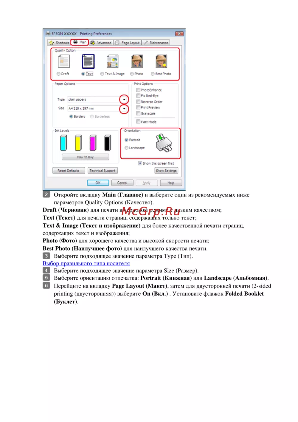 Выберите ориентацию отпечатка: Portrait (Книжная) или Landscape (Альбомная).