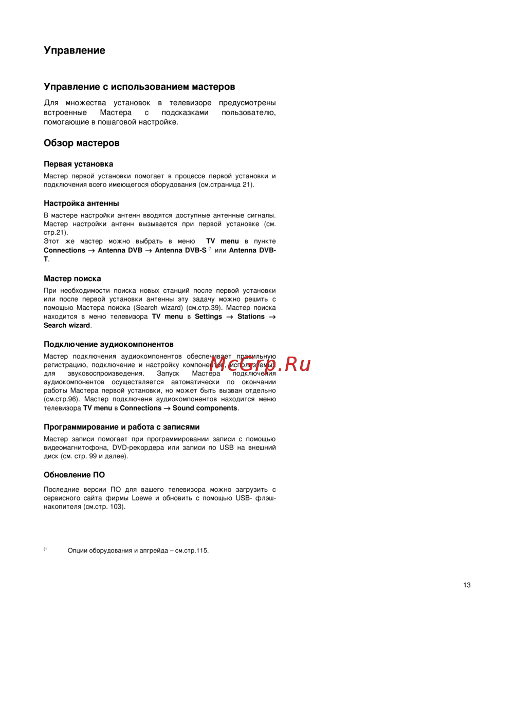 - Управление может быть в основном разделено на две области управление с помощью ниспадающих списков например списков станций списка избранного электронного справочника программ epg и т п а также управления работой в меню меню телевизора и т п для конфигурации телевизора p.13