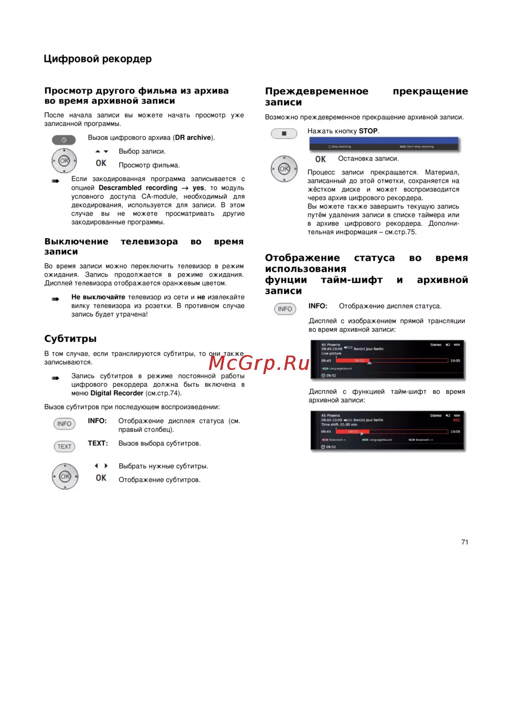 Узнайте, как использовать цифровой рекордер для записи и просмотра программ. Информация о субтитрах, архивной записи и управлении записями.
