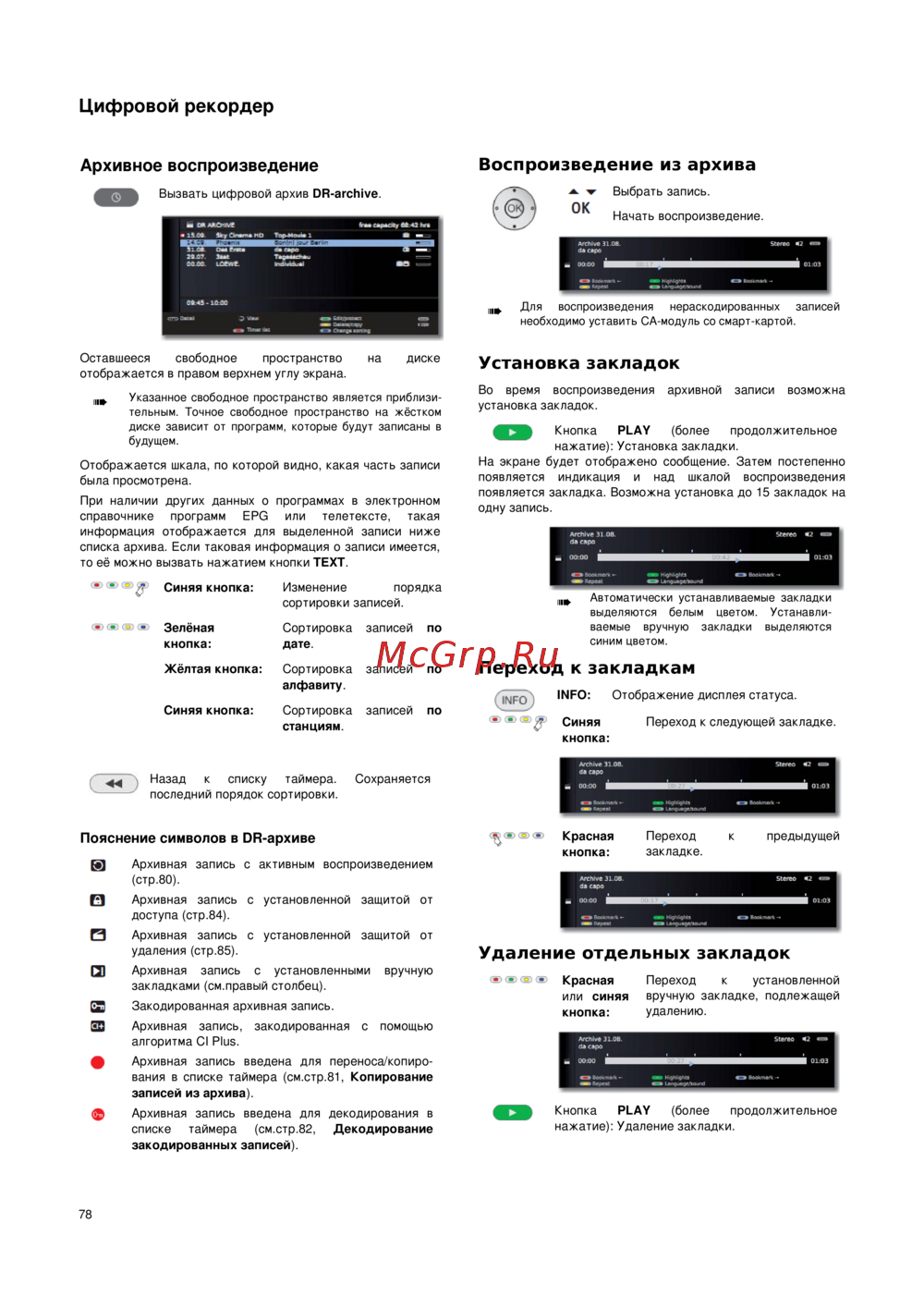 Узнайте, как эффективно управлять архивными записями на цифровом рекордере. Информация о свободном пространстве, сортировка и установка закладок для удобного воспроизведения.
