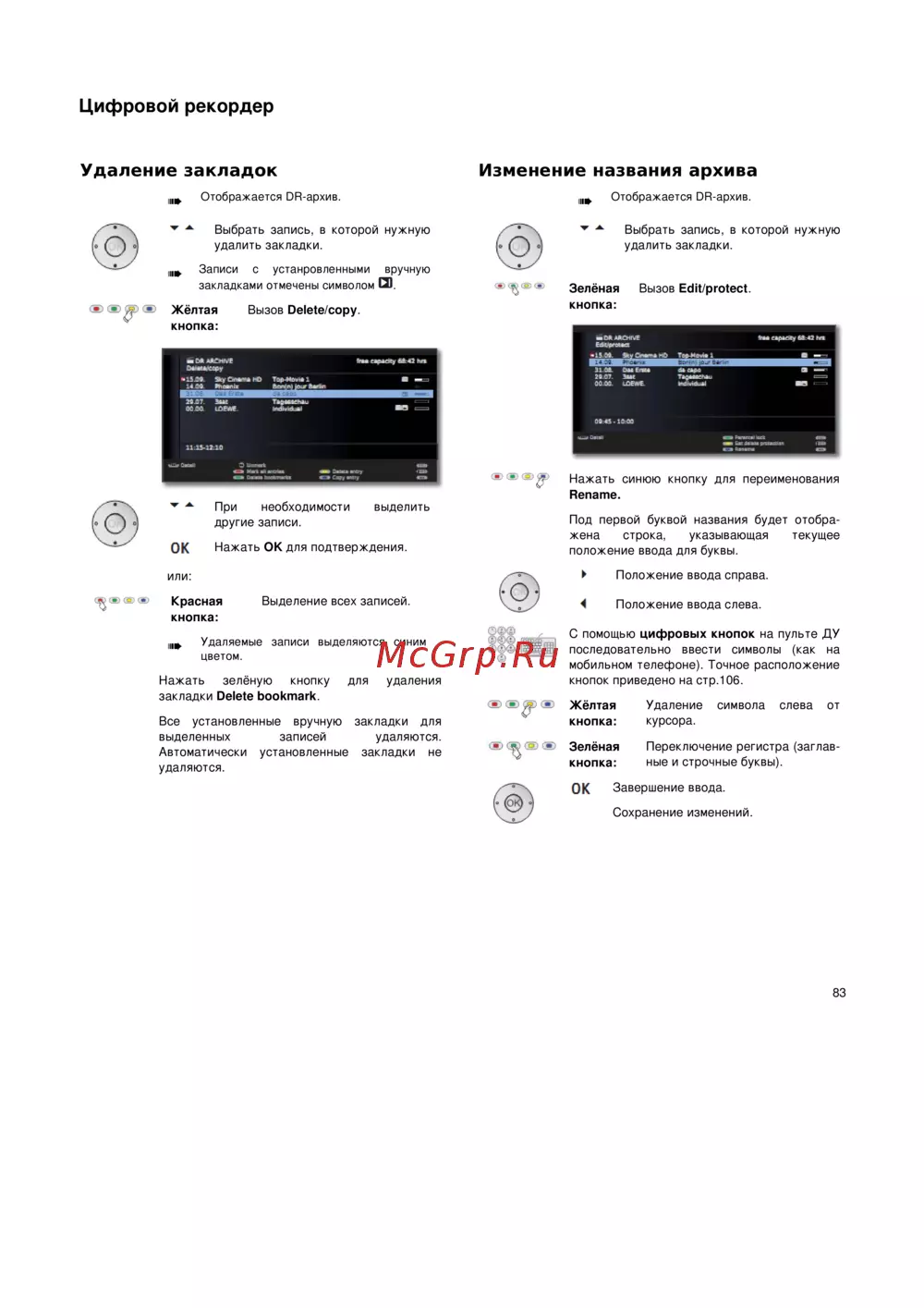Узнайте, как удалить закладки и изменить название архива на цифровом рекордере. Подробная пошаговая инструкция с описанием кнопок и действий.
