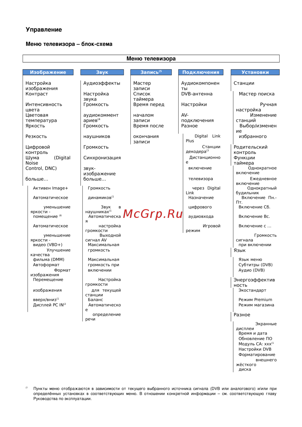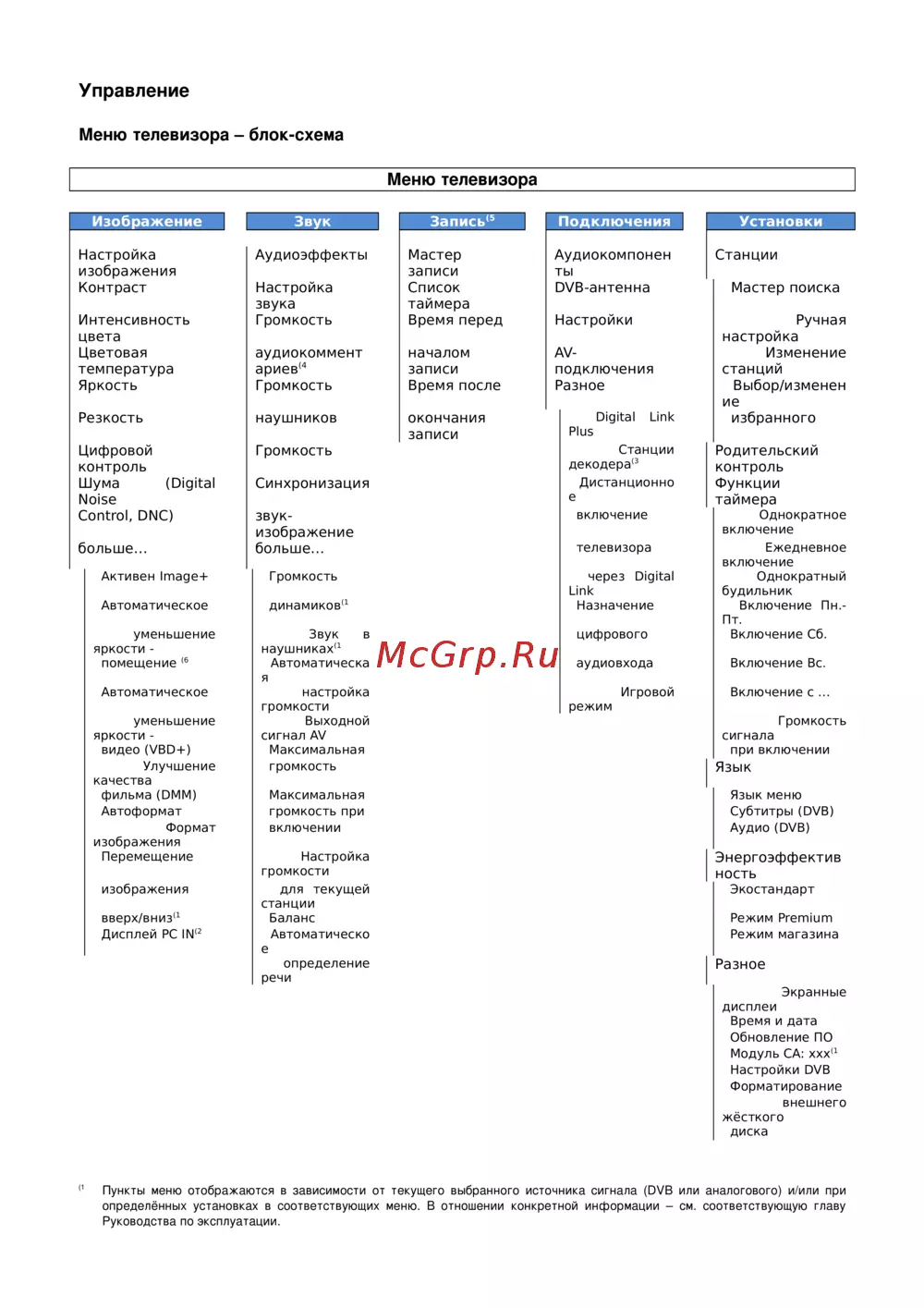 Изучите управление меню телевизора, включая настройки изображения, звука и подключения. Узнайте о функциях, таких как таймеры и родительский контроль.