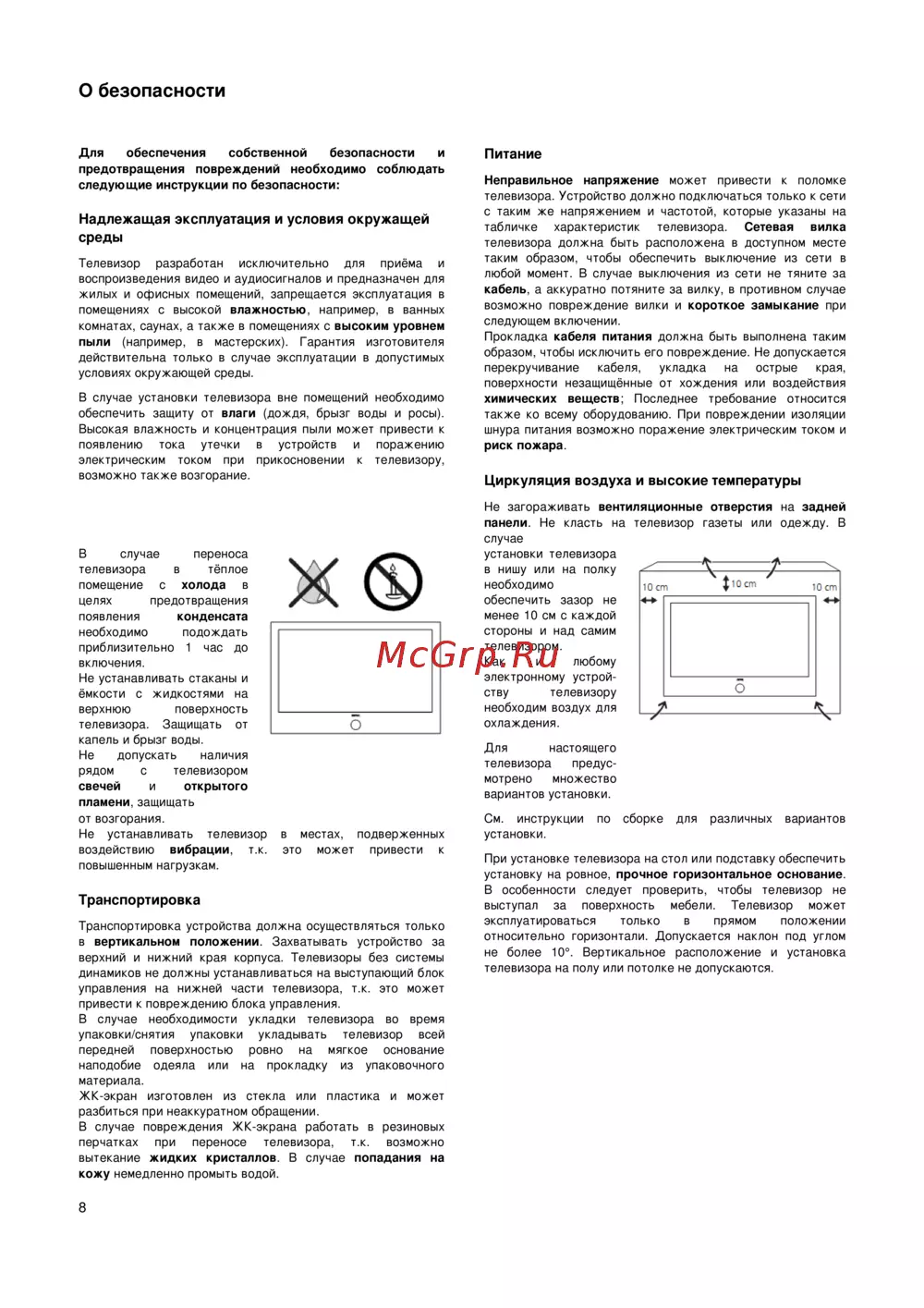 Следуйте инструкциям по безопасности для правильной эксплуатации телевизоров. Узнайте о допустимых условиях, подключении и предотвращении повреждений.