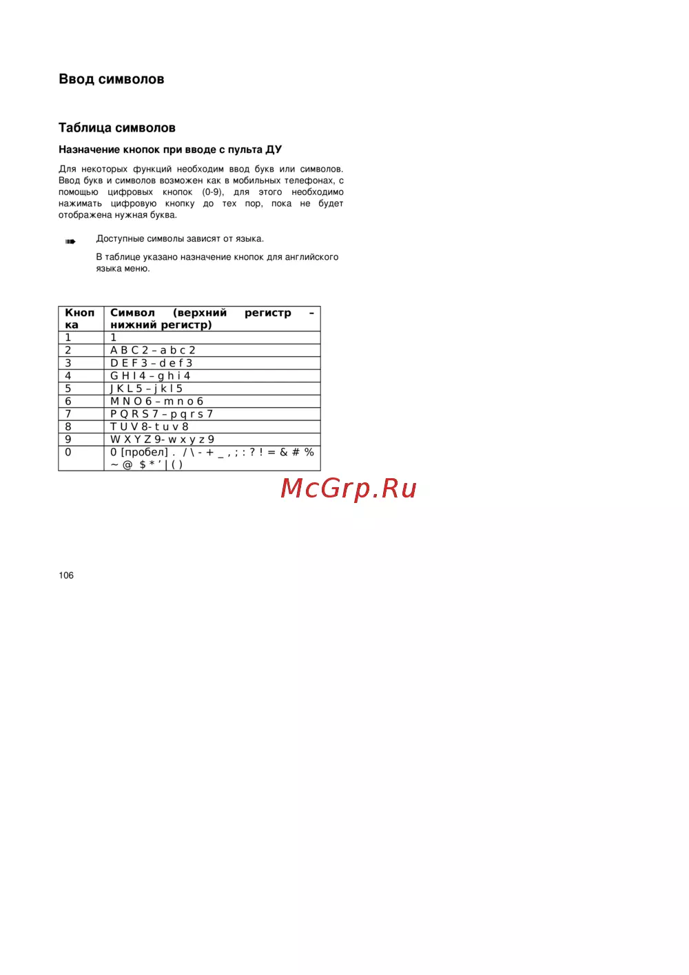 Узнайте, как вводить буквы и символы с помощью пульта ДУ. Ознакомьтесь с таблицей символов и назначением кнопок для удобного использования.
