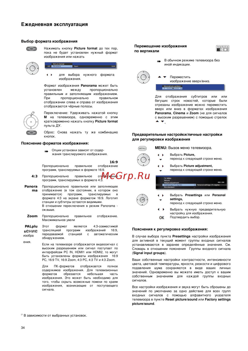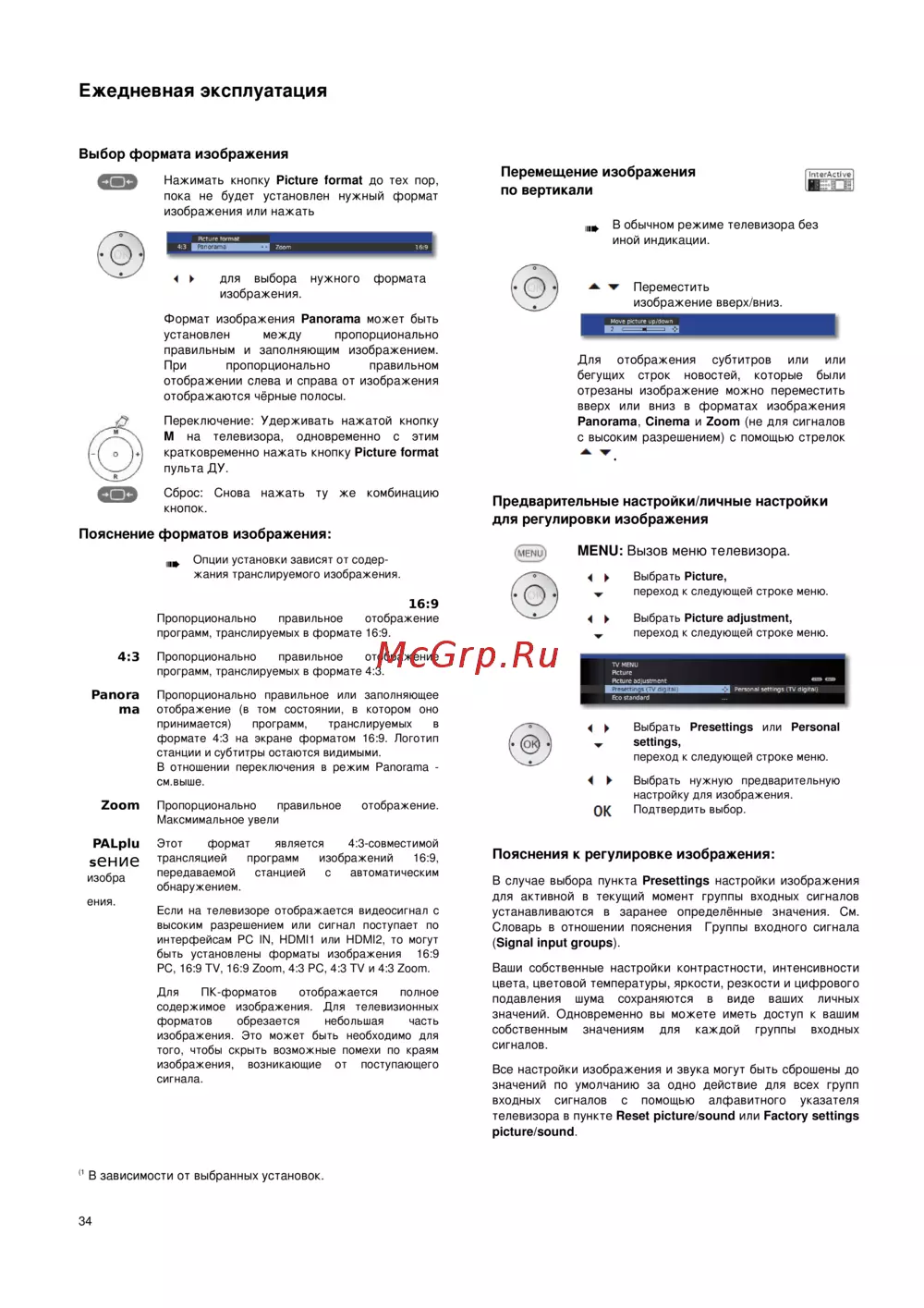 PC, 16:9 TV, 16:9 Zoom, 4:3 PC, 4:3 TV и 4:3 Zoom.
