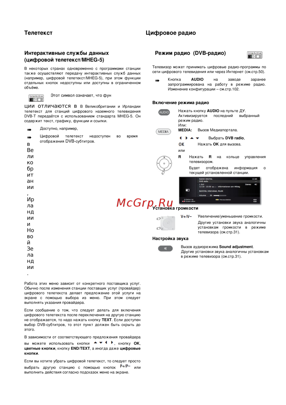 Узнайте о цифровом телетексте и радио, их функциях и управлении. Получите информацию о настройках и возможностях интерактивных служб данных.