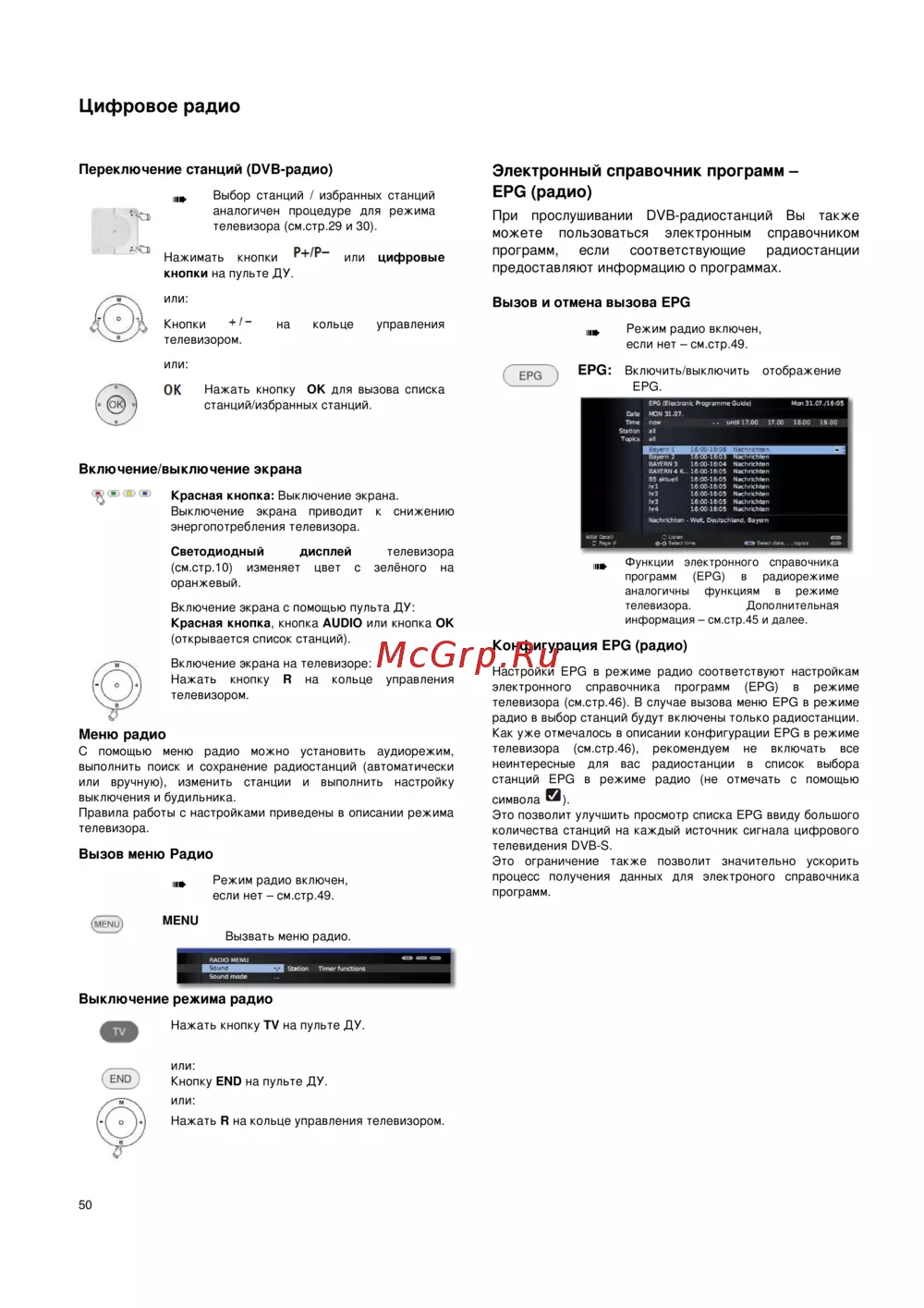 - Использование пульта ду для управления телевизором в режиме радио p.120