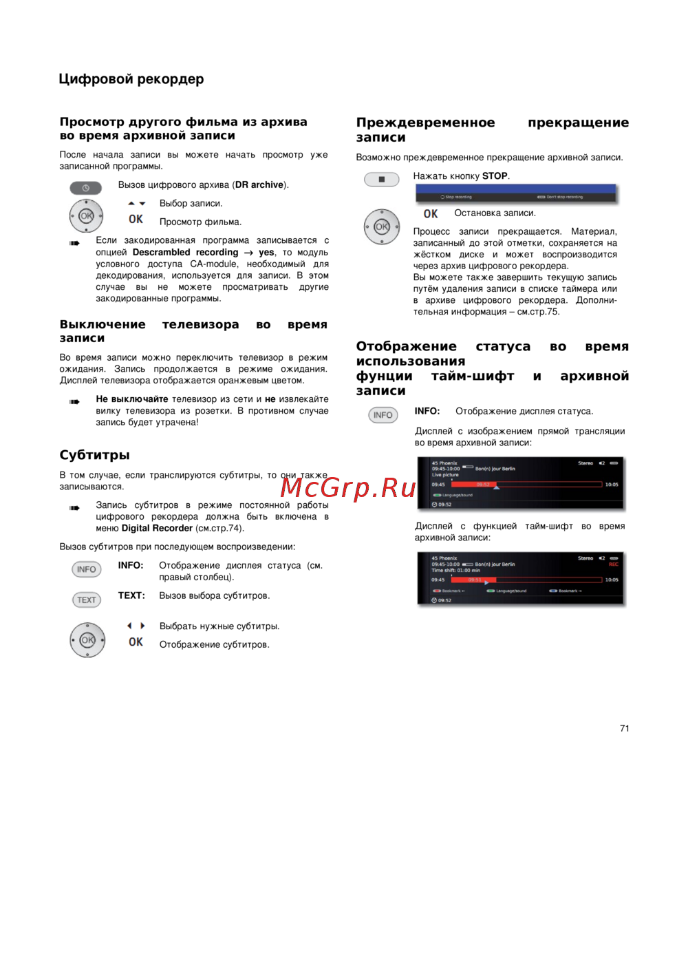 Узнайте, как использовать цифровой рекордер для архивной записи и просмотра фильмов. Включение субтитров, управление записями и советы по использованию.