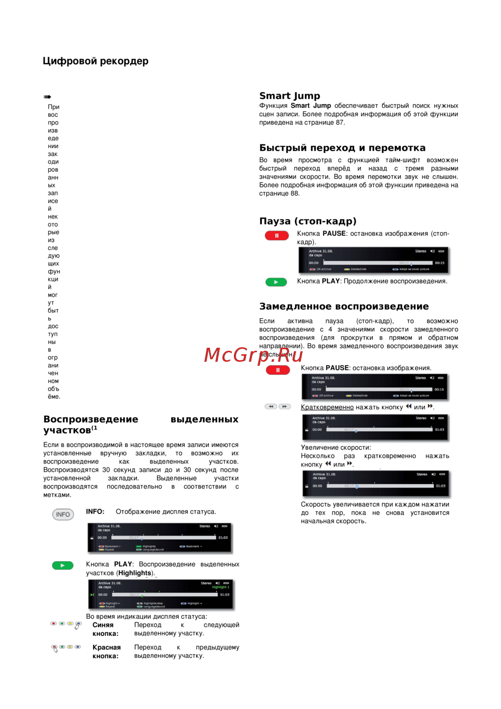 Изучите функции цифрового рекордера, включая воспроизведение выделенных участков, быстрый поиск сцен и замедленное воспроизведение. Узнайте, как управлять записями эффективно.