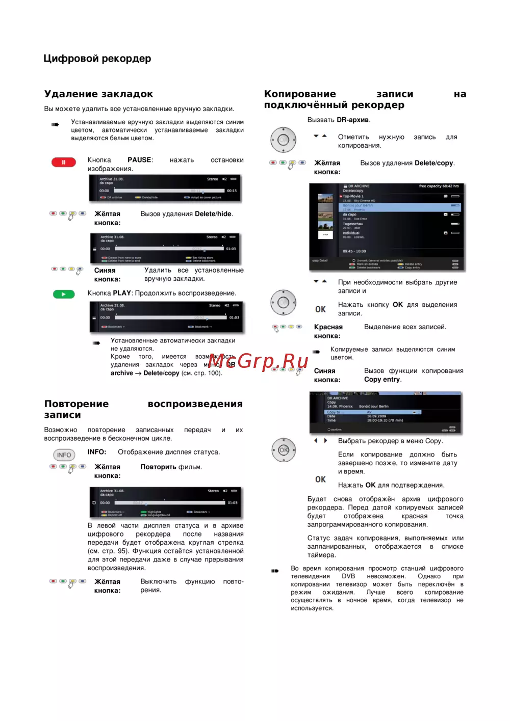 Узнайте, как удалить закладки и повторить воспроизведение записей на цифровом рекордере. Полезные советы по копированию и управлению записями.