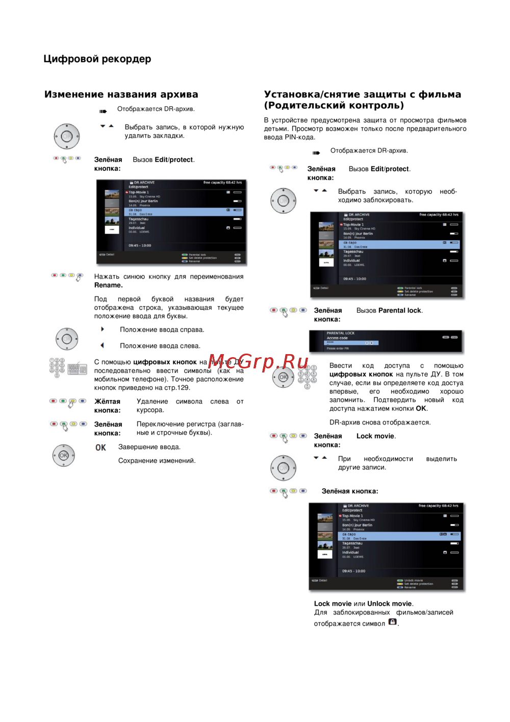 Узнайте, как переименовать записи в цифровом рекордере и установить родительский контроль. Подробные инструкции по использованию кнопок и вводу PIN-кода.
