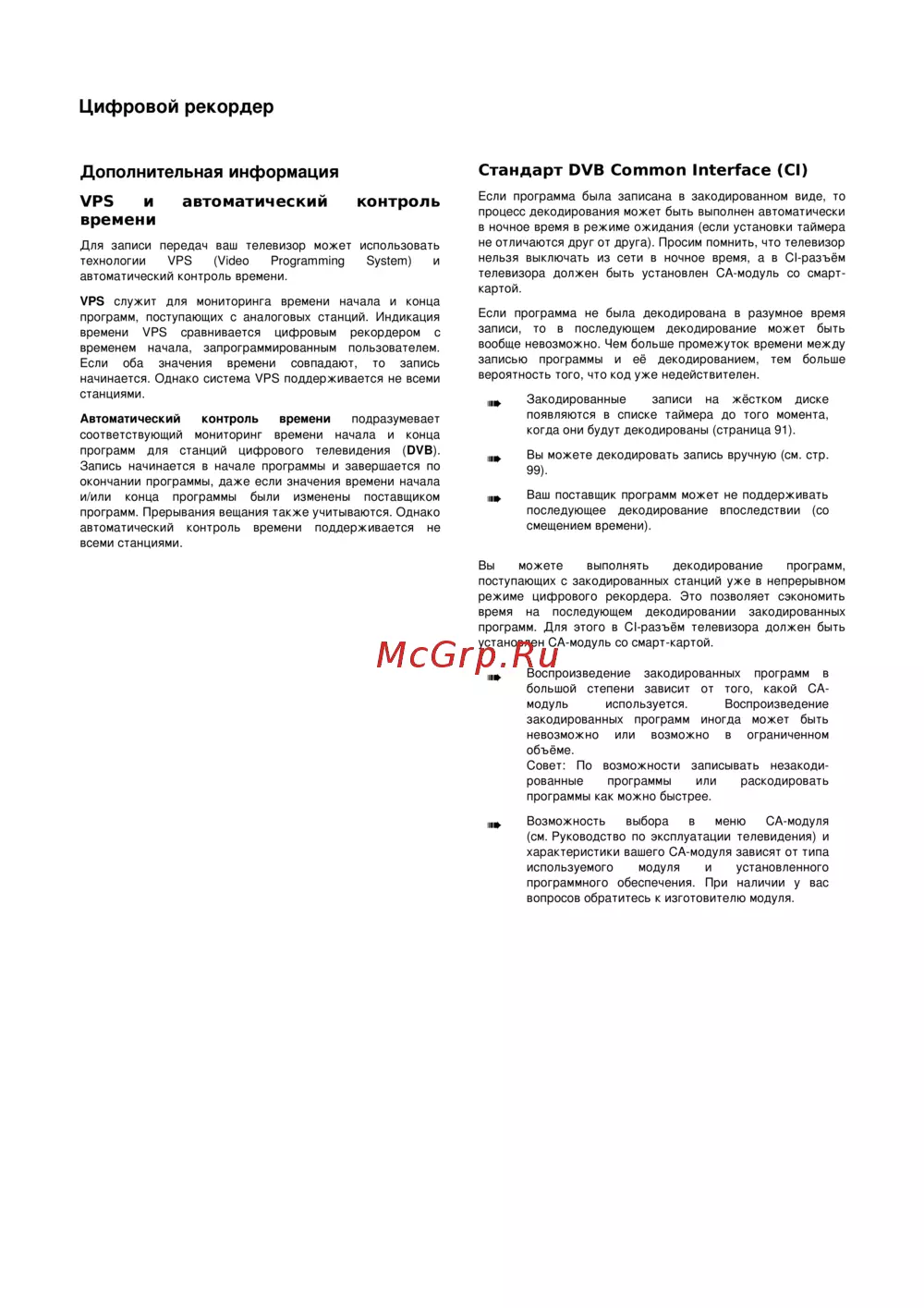 Узнайте о возможностях цифрового рекордера, включая технологии VPS и автоматический контроль времени для записи программ. Обеспечьте качественное декодирование и сохранение контента.