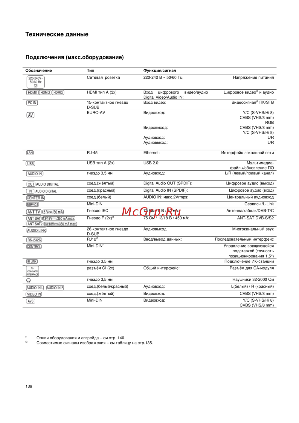 Совместимые сигналы изображения – см.таблицу на стр.135.