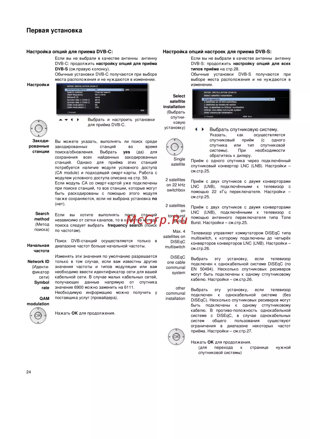 Настройка опций для приема DVB-C: Настройка опций настроек для приема DVB-S: