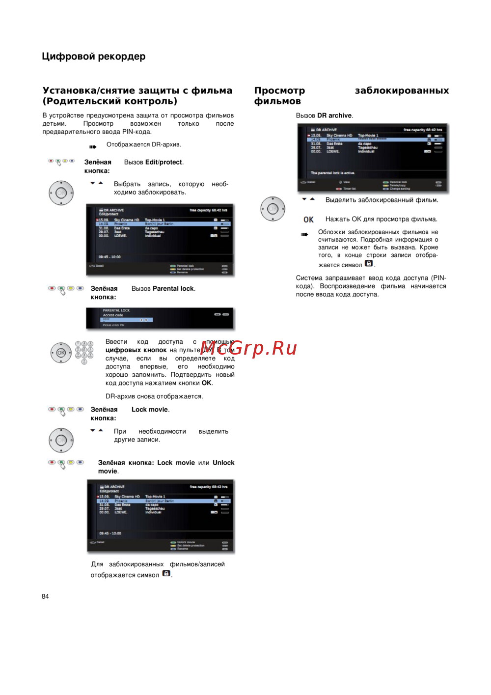 - Кодовый номер отменяет код доступа и тем самым функцию родительского контроля хранить этот номер в безопасном месте p.135