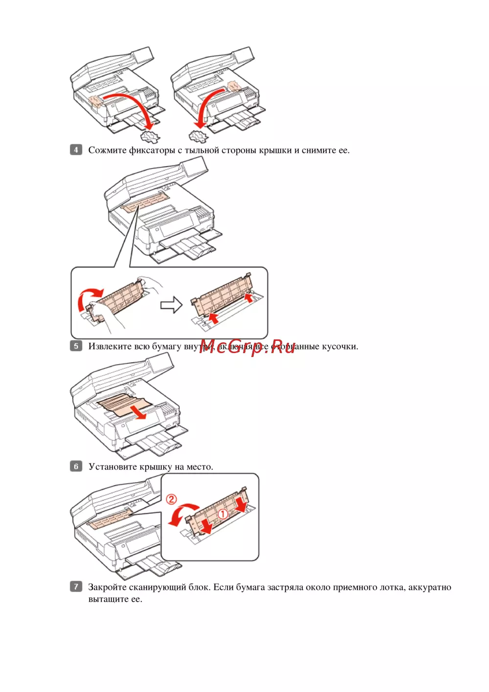 Закройте сканирующий блок. Если бумага застряла около приемного лотка, аккуратно